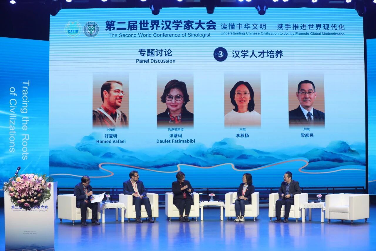 在“汉学人才培养”专题讨论发言环节,哈萨克斯坦汉学家法蒂玛以“论现代哈萨克斯坦中国研究的现状”为题,伊朗汉学家好麦特以“探讨在中国新时代框架内汉学家们的使命”为题,天津师范大学教授李秋杨以“新汉学视域下当代西班牙汉语教学与研究的回顾与展望”为题,北京语言大学国际中文学院党委书记梁彦民以“汉学研究视野的国际中文教育体系创新”为题进行主旨发言,北京语言大学国际关系学院院长贾烈英主持本场发言。