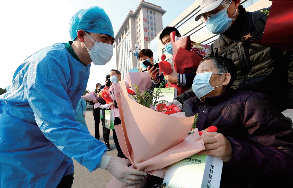 中部战区总医院又一批治愈患者康复出院,主治医师为老人献上鲜花