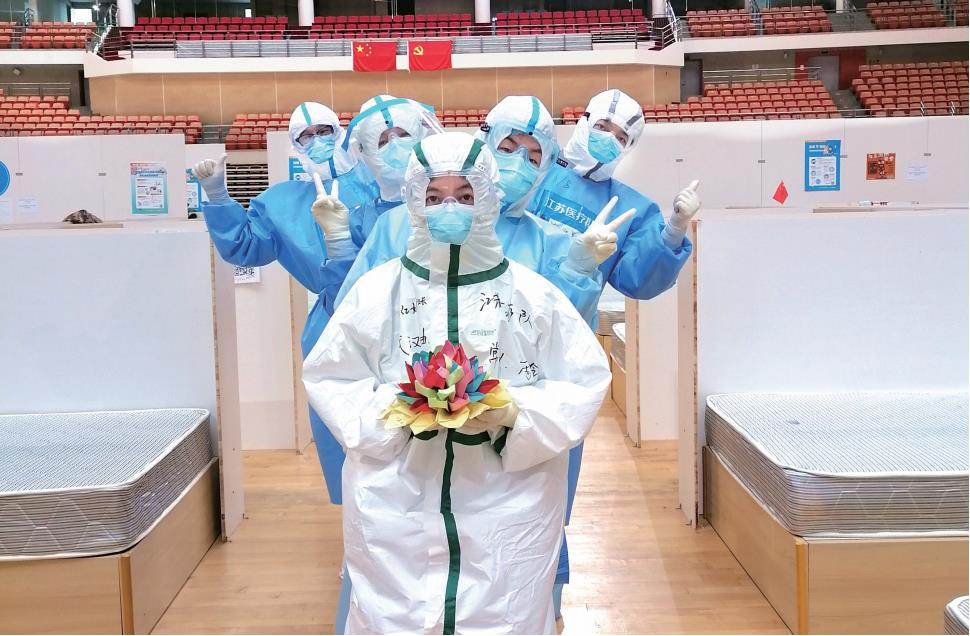 2020年3月8日,武汉开发区体育中心方舱医院正式休舱,来自江苏援鄂医疗队的医护人员拍照留念