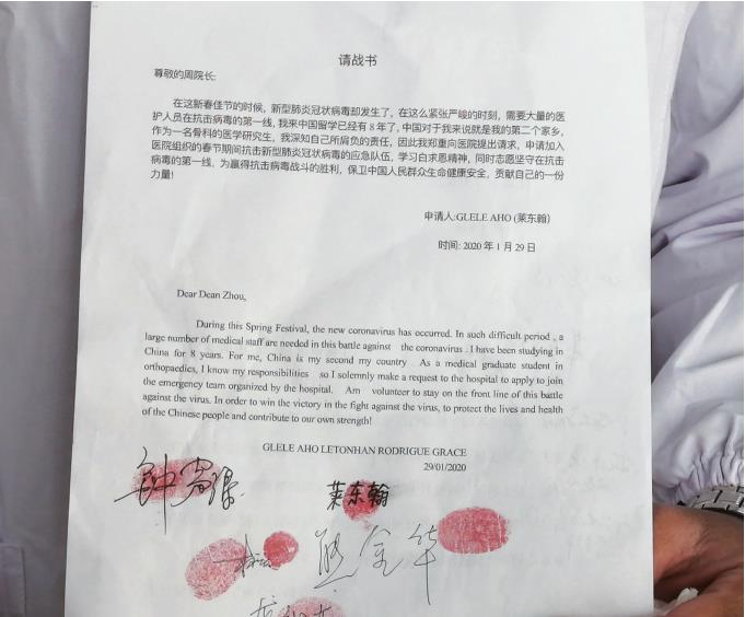 在抗疫请战书上,我特意用中英文双语写道:“作为一名骨科的医学研究生,我深知自己所肩负的责任,因此我郑重向医院提出请求,申请加入医院组织的春节期间抗击新型冠状病毒肺炎的应急队伍,学习白求恩精神,同时志愿坚守在抗击病毒的第一线,为赢得抗击病毒战斗的胜利,保卫中国人民群众生命健康安全,贡献自己的一份力量!”