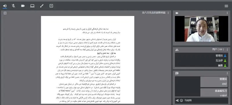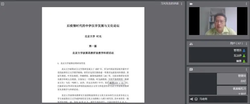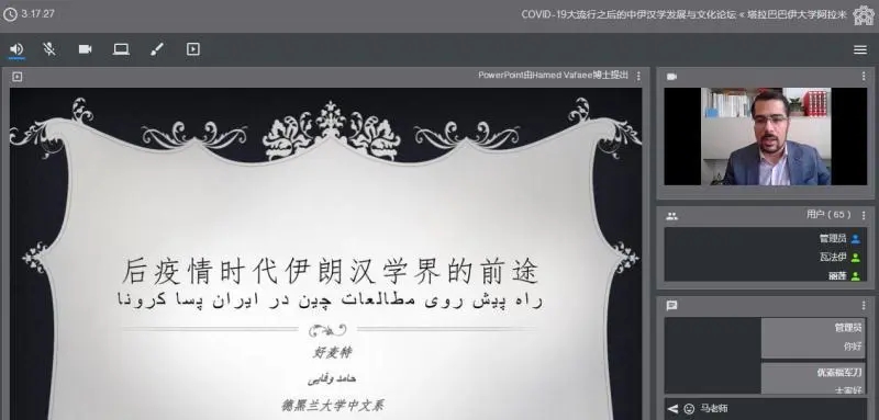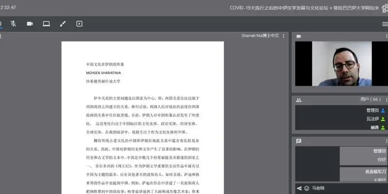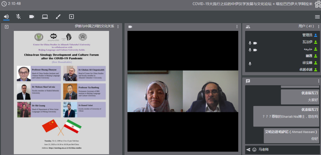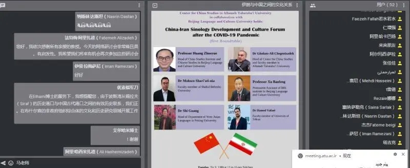 2020年6月23日,由北京语言大学、伊朗驻华使馆、阿拉麦塔巴塔巴伊大学、德黑兰大学、圣拉兹大学主办,北京语言大学一带一路研究院承办,中国文化译研网(CCTSS)平台支持的“后疫情时代的中伊汉学发展与文化论坛”第一次会议以视频会议的形式顺利举行。