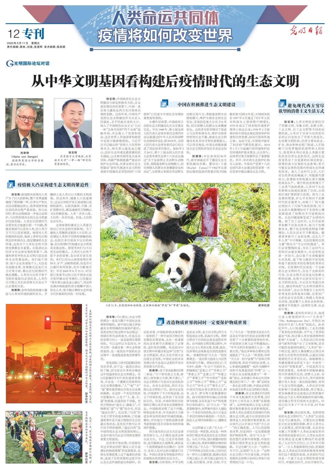 《光明日报》2020年9月11日 第12版整版刊发著名汉学家胜雅律与北京语言大学教授徐宝锋关于“从中华文明基因看构建后疫情时代的生态文明”的对话文章,着力探讨“人类命运共同体”背景下全球范围内的生态文明建设问题。