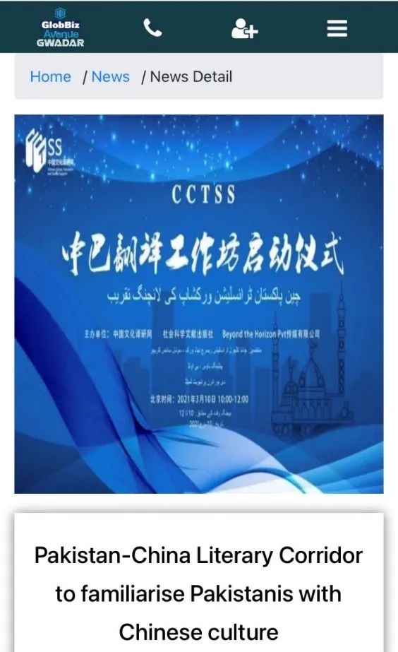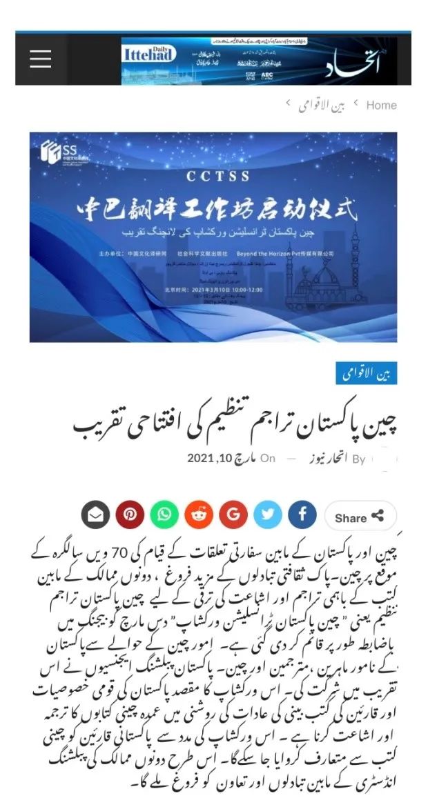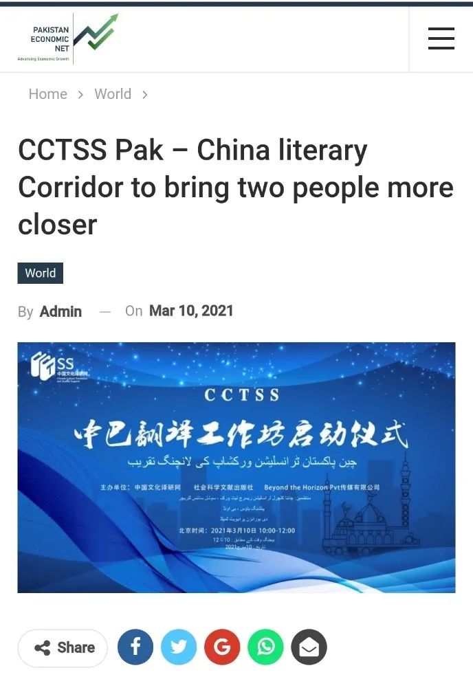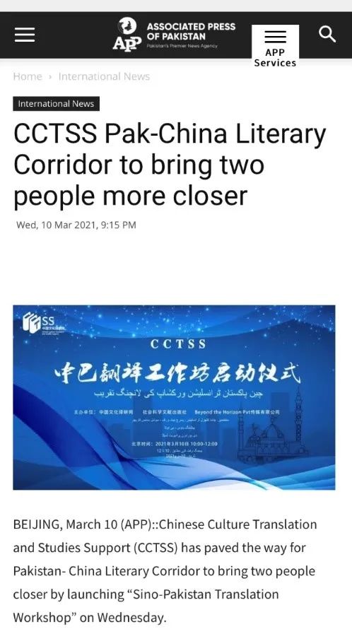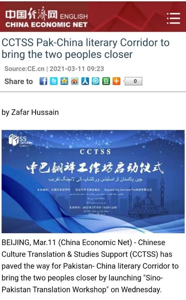 2021年正值中巴建交70周年,中国文化译研网(ChineseCultureandTranslationStudiesSupport)联合社会科学文献出版社、巴基斯坦BeyondtheHorizonPvt传媒有限公司在京举办“CCTSS中巴翻译工作坊”启动仪式。