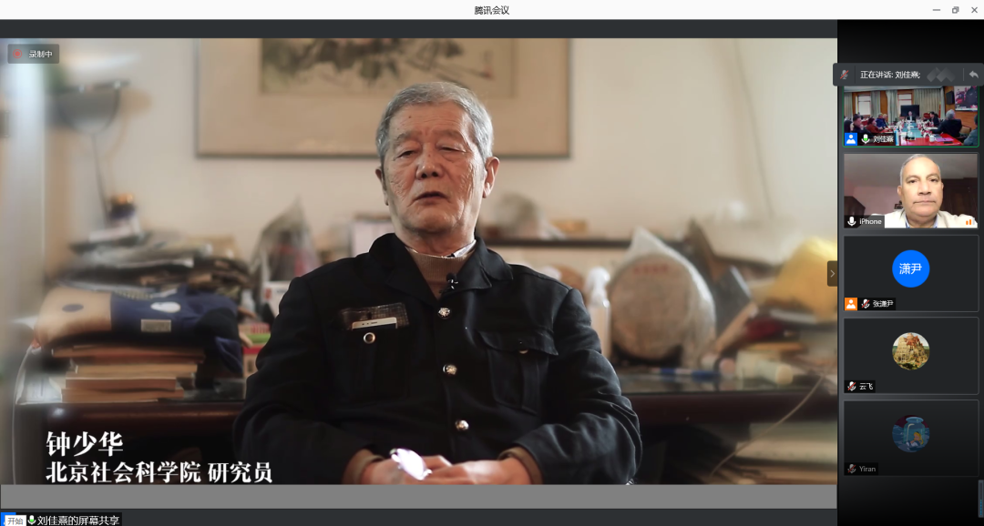 钟少华研究员通过视频的方式谈到了汉学家口述应该注意的核心问题和解决方案,他认为口述史要尽可能保留口述者所讲的原内容,采访前必须先了解口述史对象对中国的关注和研究取得了什么成果,在此基础上进行关键性内容的采访与提炼,更进一步写出精彩的、有深度的口述史。