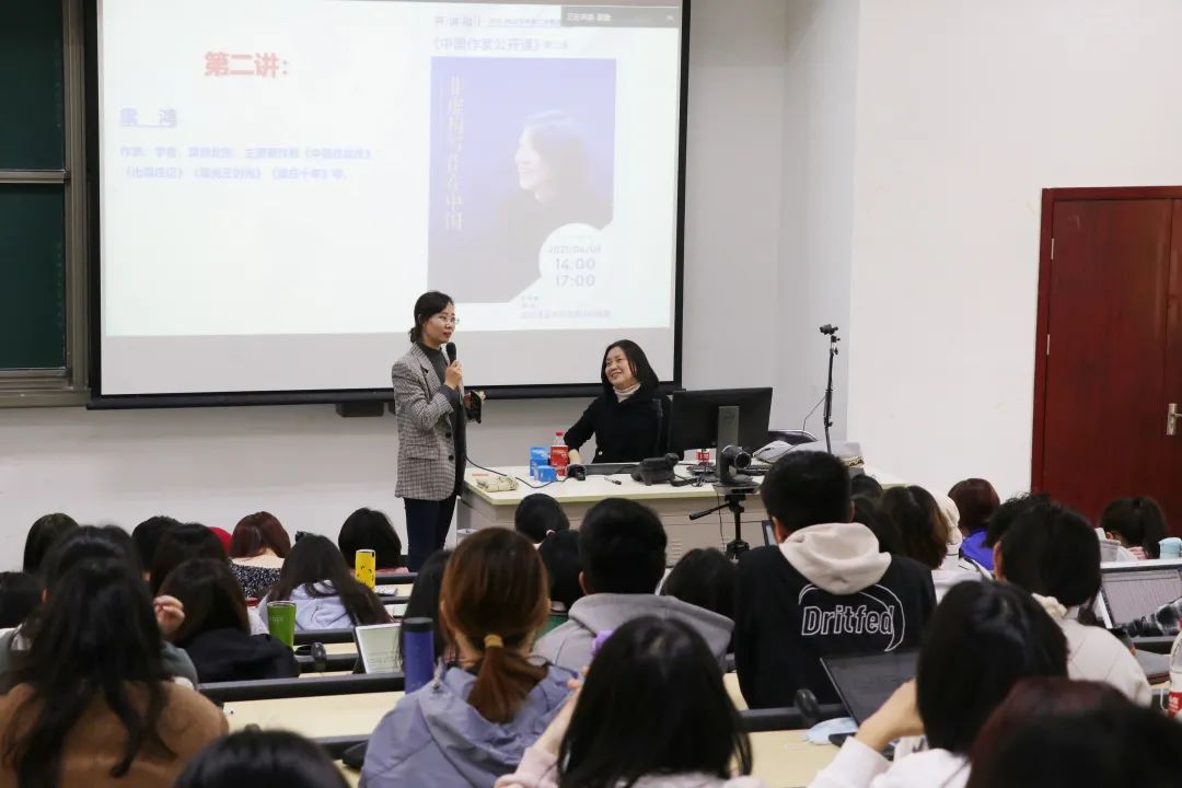 2021年4月9日下午两点,“中国作家公开课”以线上线下同步方式开讲,著名作家梁鸿教授做了题为“非虚构写作在中国”的演讲,并与美国作家马克·力文隔空对话,畅谈非虚构写作。北京语言大学一带一路研究院副院长黄悦教授主持课程,百花文艺出版社《小说月报》副主编徐福伟、北京语言大学新闻传播学院副教授张海华等校内外专家出席了讲座,校内外两百余名中外师生参与了课程。