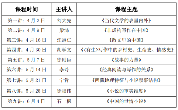 本课程由我校教师联合百花文艺出版社《小说月报》,邀请中国当代有影响力的作家、批评家轮流讲授,从研究和创作两个角度引导学生阅读当代经典,关怀中国社会,提升人文修养。课程内容以教师讲授、作家讲座和专题研讨三个部分构成,涉及当代中国文学的不同类型和社会生活的不同方面。通过这门课的学习,学生们将从作家的创作心得、业内专家的对话、国内外作家的交流互动中获得立体而鲜活的文学经验,以此提升文学鉴赏能力,深化对当代中国的理解与思考。