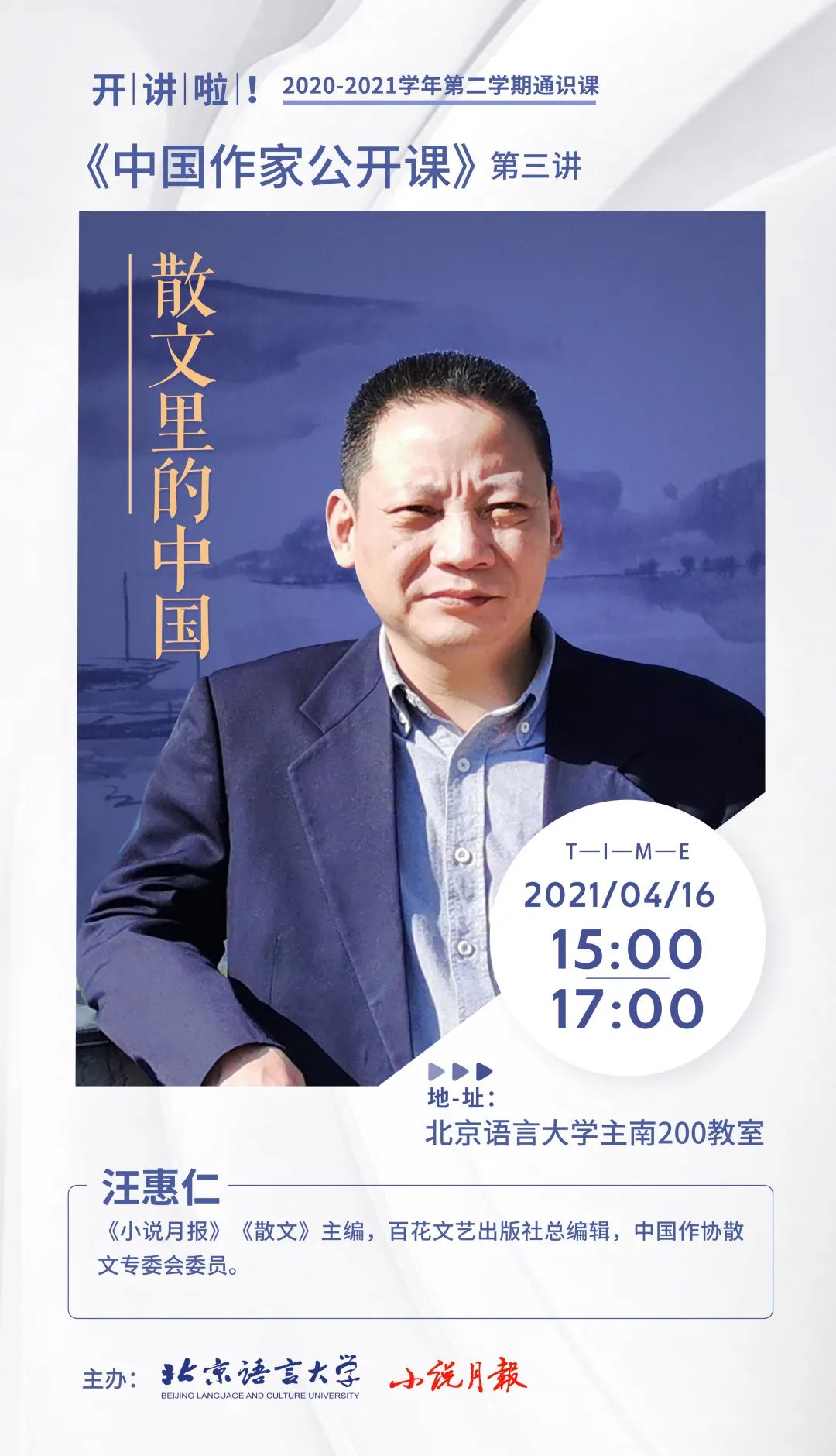 《中国作家公开课》旨在引导中外学生阅读文学经典,使中外学生通过面对面聆听中国当代作家的专题演讲获得对中国当代文学与中国社会的认知和体悟,以文学透视社会,以研讨提升思考,促进中外学生对当代中国的理解与认同。