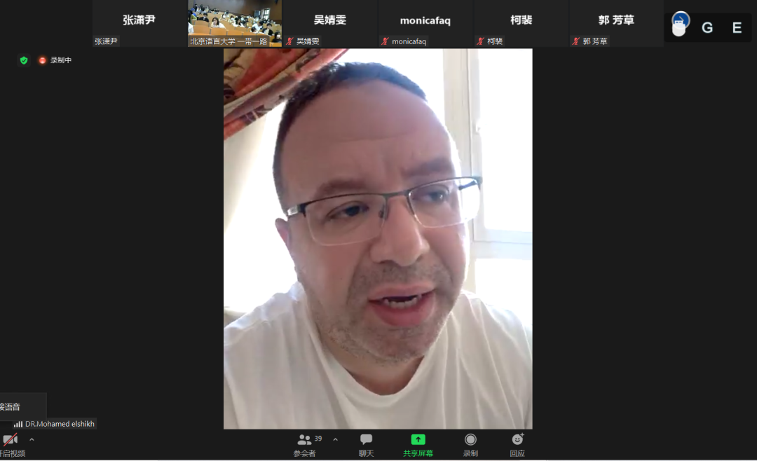 最后的互动交流环节,现场连线了埃及汉学家、中国文化译研网(CCTSS)会员、埃及英国大学人文学院中文系兼职讲师、埃及明亚大学语言学院中文系全职讲师谢赫,谢赫首先介绍了中国当代文学作品在埃及的传播与接受情况,进而从自身的阅读与翻译经验出发,分享了他翻译周大新作品、阅读麦家作品的体会,重点谈到了CCTSS平台对于他翻译作品传播与交流的重要性,盛赞《中国作家公开课》有新意、有意义、有深度。今年正值中国与埃及建交65周年,中国和埃及的大学都设立了更多的阿拉伯语和中文专业,如何让这些懂语言的人更加懂中国,文学是一个不可或缺的渠道。
