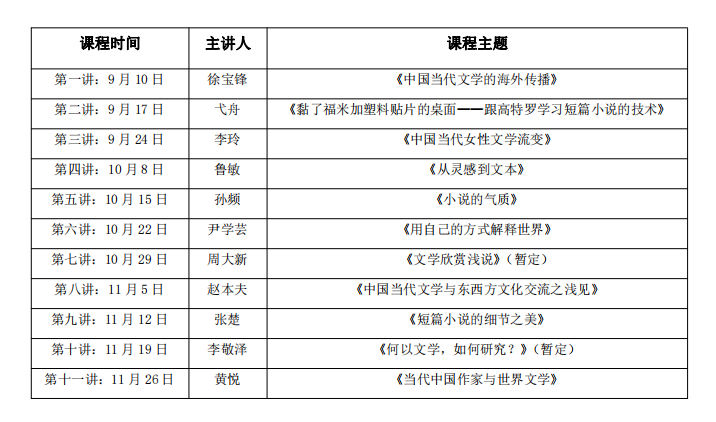 本学期中国作家公开课将继续与《小说月报》合作,邀请中国当代有影响力的作家、批评家走进课堂,与海内外、课堂内外的读者、译者展开对话,为助力中国文学“走出去”搭建活跃的交流平台,为提升我校大学生的文学素养和跨文化交际能力贡献力量。