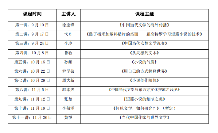 《中国作家公开课》以北京语言大学的校内通识课为基础,由我校教师联合百花文艺出版社《小说月报》,邀请中国当代有影响力的作家、批评家联合讲授,旨在引导大学生阅读当代经典,关怀中国社会,提升人文修养。
