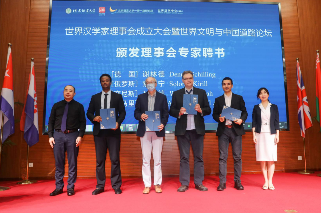 北京语言大学人事处处长郁有学、北京语言大学科研处处长张健为德国汉学家谢林德(DennisSchilling)、俄罗斯汉学家索罗宁(SoloninKirill)、突尼斯汉学家瓦利德(WalidAbdallah)、索马里汉学家伊斯曼(AbdilahiIsmailAbdilahi)颁发了理事会专家聘书。