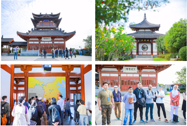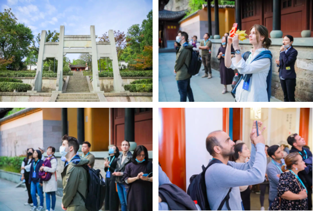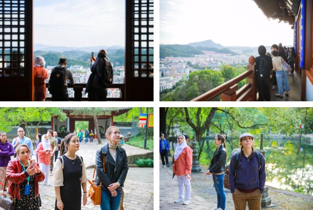 今天,来自6大洲,14国的汉学青年学者穿越时光,沿着千年前那些名动神州的诗坛巨星的步旅,来到鼓山之顶,登上天姥阁,极目远眺,天姥风光尽收眼底,俯视而下,整个新昌县城一览无余,壮阔的新昌江穿城而过。学者们漫步太白堂,吟诵千古名篇,贴近一颗浪漫的诗心。在青山绿水之间,感受江南风物,赓续千年文脉。