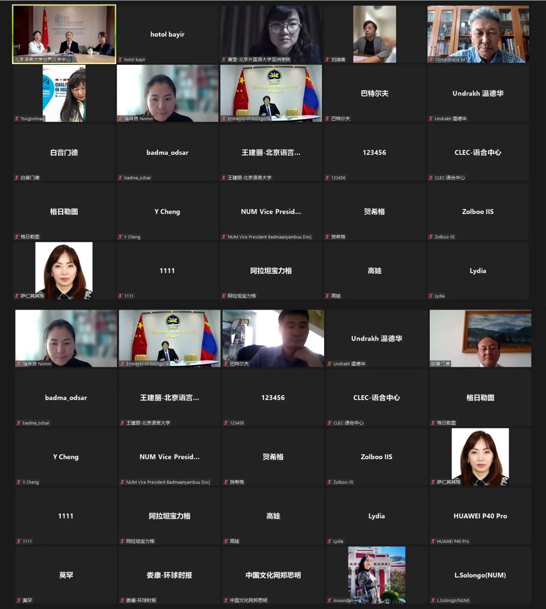 北京时间10月26日,由北京语言大学主办,蒙古国驻华大使馆协办,北京语言大学世界汉学中心、中国文化译研网(CCTSS)承办的蒙古国汉学家理事会成立仪式暨第二届“中蒙汉学与文化发展论坛”在线上成功举办。蒙古国驻华使馆政务参赞满都呼,中外语言合作交流中心汉学处处长张科出席会议并发表致辞,蒙古国汉学家理事会理事长、蒙古国立大学副校长巴德玛宁布(BAdmaanyambuuDorj),蒙古国立大学孔子学院院长其米德策耶(M.CHIMEDTSEYE),蒙古国立大学副教授额格希格(SH.EGSHIG),乌兰巴托大学中文系主任萨仁其其格(E.SARANTSETSEG),蒙古国中国历史文化研究会会长巴特尔夫(KH.BAATARKHUU),蒙古国立大学副教授温德华(DAVAASURENUNDRAKH),奥特根腾格尔大学学术委员会委员瑙咪告(E.NOMIN)等理事与会,内蒙古大学民族学与社会学学院院长阿拉坦宝力格,内蒙古大学蒙古学学院教授巴达玛敖德斯尔,内蒙古大学蒙古国研究中心主任白音门德,内蒙古师范大学教授何群,中国社会科学院民族学与人类学研究所民族语言实验研究室主任呼和,北京外国语大学亚洲学院蒙古语教研室主任黄莹,北京大学外国语学院副教授刘迪南,北京语言大学一带一路研究院副院长、教授黄悦等中方专家与会。会议由世界汉学中心主任、北京语言大学“一带一路”研究院院长徐宝锋主持。