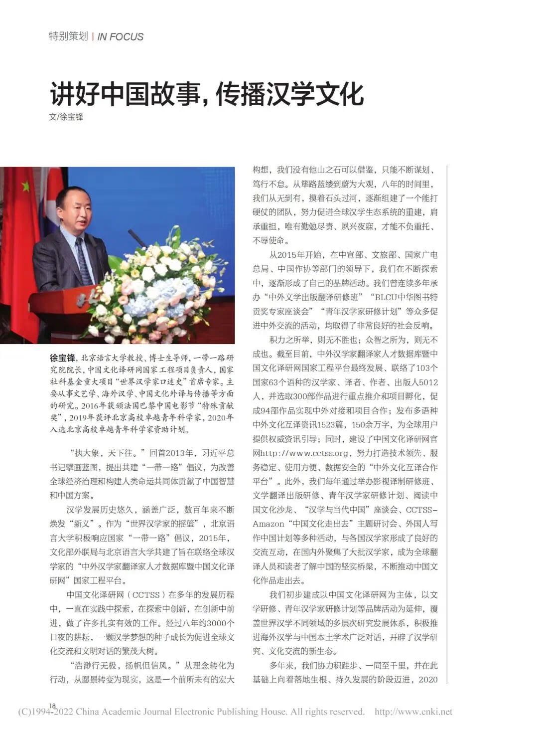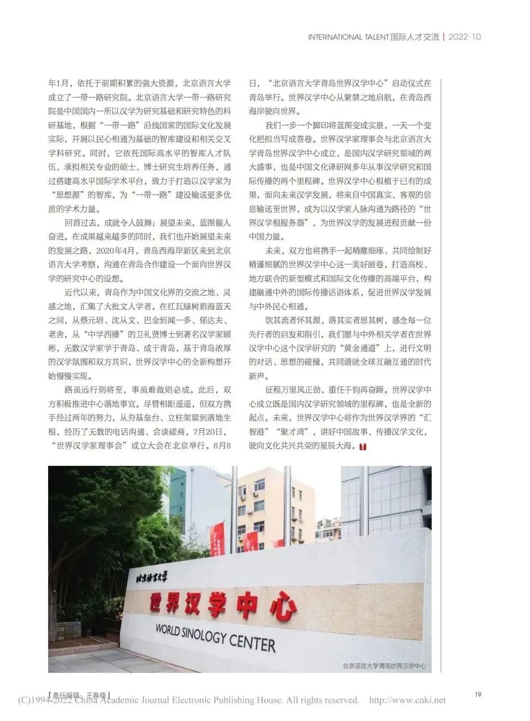 近日,北京语言大学“一带一路”研究院院长,世界汉学中心主任、首席专家徐宝锋在《国际人才交流》杂志发表署名文章《讲好中国故事,传播汉学文化》。