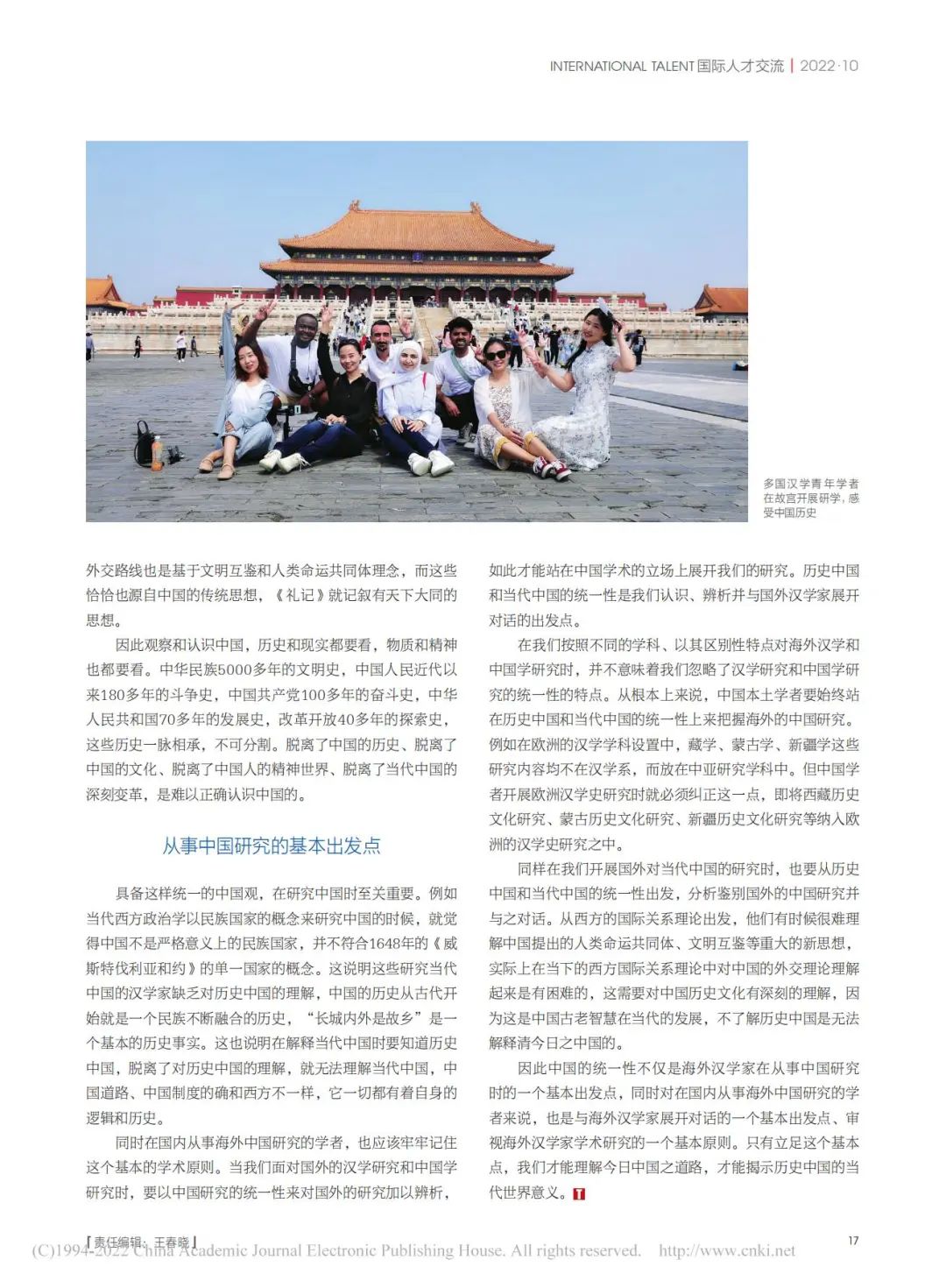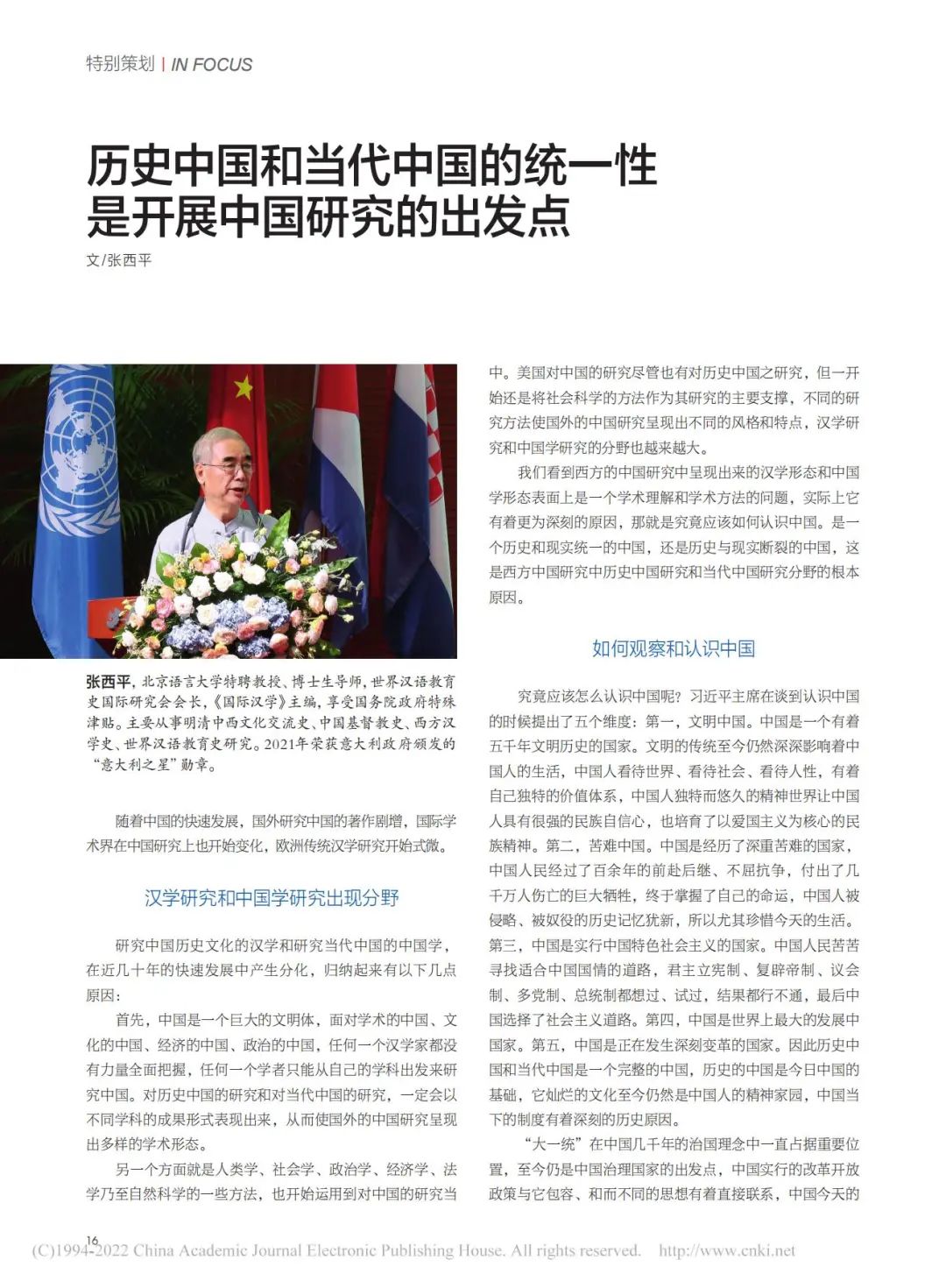 近日,北京语言大学特聘教授、博士生导师,世界汉语教育史国际研究会会长,《国际汉学》主编张西平在《国际人才交流》杂志发表署名文章《历史中国和当代中国的统一性是开展中国研究的出发点》。