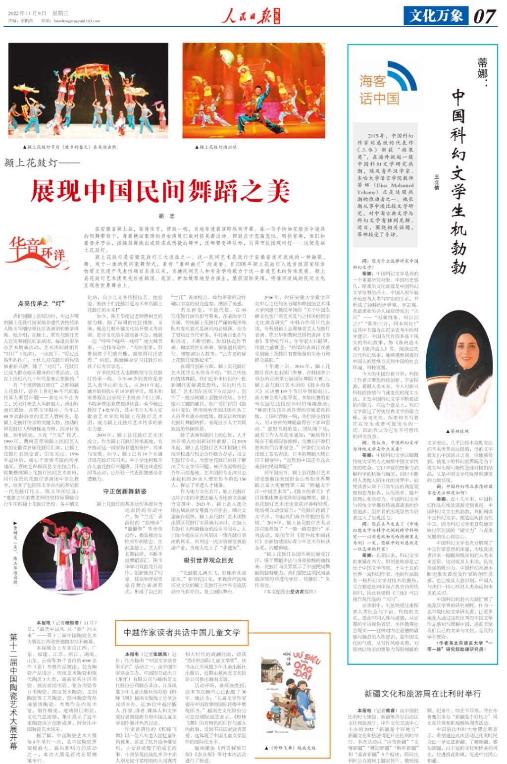 2022年11月9日,由国家社科基金重大项目“世界汉学家口述中文与中华文化国际传播史”及北京高校卓越青年科学家计划“一带一路汉学话语体系研究”项目提供学术支持的汉学访谈《蒂娜:中国科幻文学生机勃勃》一文刊载于《人民日报》(海外版)第7版。
