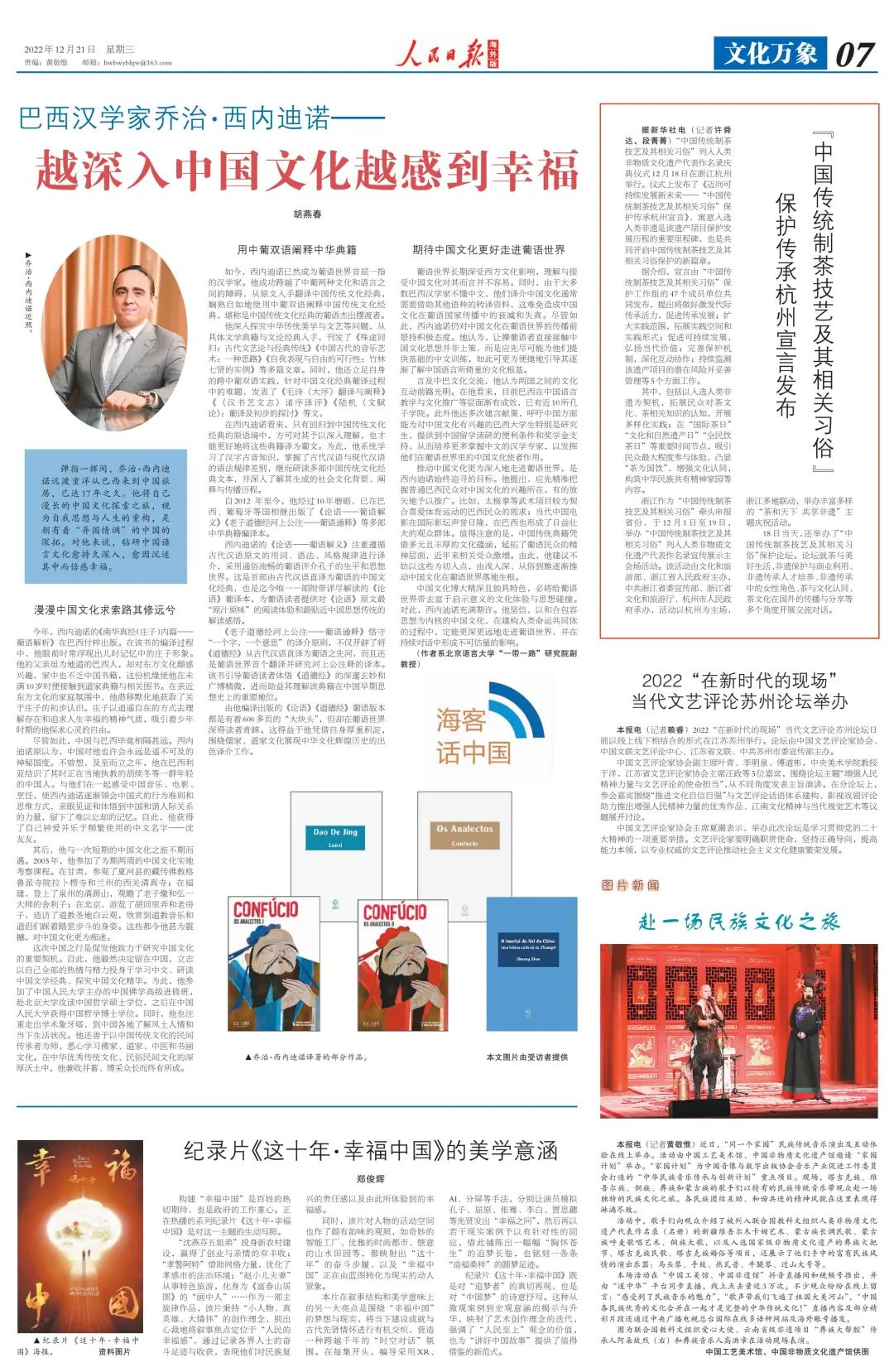 2022年12月21日,由国家社科基金重大项目“世界汉学家口述中文与中华文化国际传播史”及北京高校卓越青年科学家计划“一带一路汉学话语体系研究”项目提供学术支持的汉学访谈《巴西汉学家乔治·西内迪诺——越深入中国文化越感到幸福》一文刊载于《人民日报》(海外版)第7版。