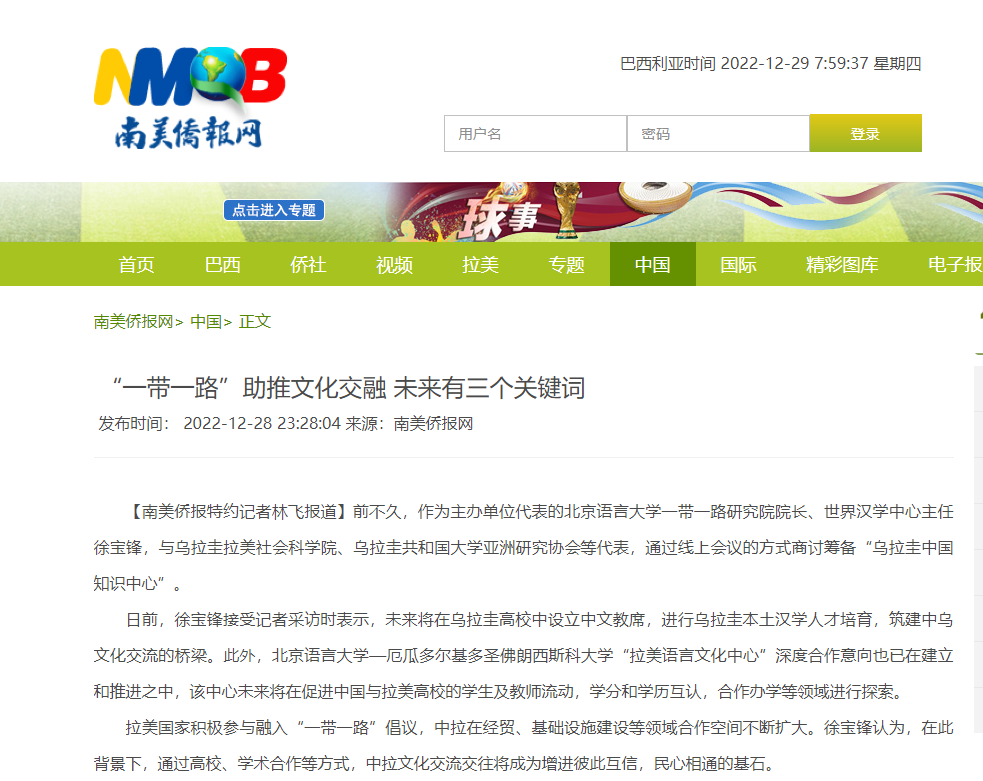 前不久,作为主办单位代表的北京语言大学一带一路研究院院长、世界汉学中心主任徐宝锋,与乌拉圭拉美社会科学院、乌拉圭共和国大学亚洲研究协会等代表,通过线上会议的方式商讨筹备“乌拉圭中国知识中心”。