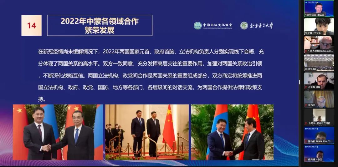 蒙古国翻译家、蒙古国中国历史文化研究会会长浩·巴特尔夫(BaatarkhuuKh.)通过翻译实践分享了自己对于中国式现代化的理解。巴特尔夫指出,《习近平谈治国理政》第一卷、《摆脱贫困》这两部作品是时代之作,在蒙古国很受欢迎。中国的现代化经验给对蒙古国的发展有极强的借鉴意义,也为促进两国友好交流奠定了基础。