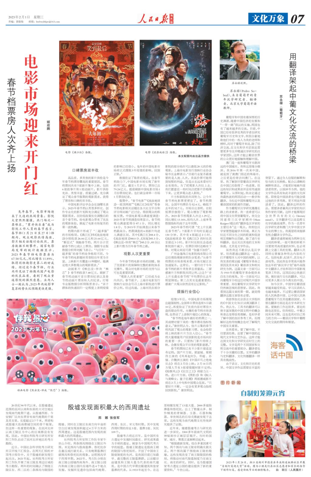 2023年02月01日,《人民日报》(海外版)第7版刊登了《用翻译架起中葡文化交流的桥梁》一文。文章由“新汉学计划”海外高级中文翻译人才培养项目——笔译工作坊学员,中国文化译研网(CCTSS)会员,葡萄牙青年汉学研究者、翻译者,北京大学葡萄牙语教师苏永禄(PedroSobral)撰写。