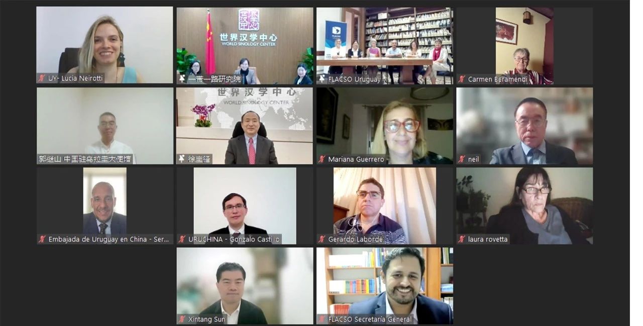 3月21日,由北京语言大学世界汉学中心联合拉丁美洲社会科学院乌拉圭分院、乌拉圭亚洲研究协会共同设立的拉美地区首个国别汉学家理事会——乌拉圭汉学家理事会正式成立。乌拉圭驻华大使费尔南多·卢格里斯(FernandoLugris),中国驻乌拉圭大使馆文化参赞郭继山、国际儒学联合会副会长牛喜平,世界汉学中心主任、一带一路研究院院长徐宝锋,乌拉圭亚非研究协会会长马丁·佩雷兹(MartínPérez),拉丁美洲社会科学院乌拉圭分院院长安娜·加布里埃拉·费尔南德斯(AnaGabrielaFernandez),乌拉圭汉学家理事会成员以及双方相关工作人员出席成立仪式,共同见证了这一历史性时刻。世界汉学中心副主任、一带一路研究院副院长黄悦主持活动。