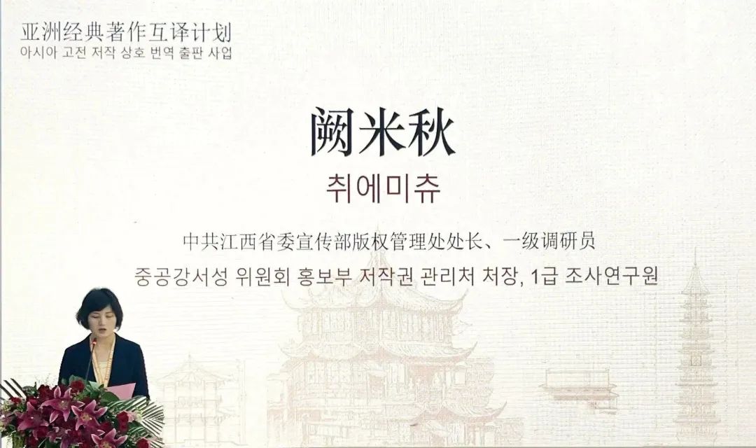 亚洲经典著作互译计划韩方委员会主席朴宰雨,韩国驻华大使馆公使衔参赞兼驻华韩国文化院院长金辰坤,亚洲经典著作互译计划中方委员会主席、中国出版协会理事长邬书林,中宣部进出口管理局副局长、一级巡视员赵海云,中国人民大学原副校长、中国人民大学出版社原社长、中韩经典著作互译计划专家委员会专家贺耀敏,中共江西省委宣传部版权管理处处长、一级调研员阙米秋,中共江西省委宣传部出版印刷发行处处长张宏涛,江西出版传媒集团党委副书记、副董事长、总经理,中文传媒党委副书记、副董事长凌卫,江西出版传媒集团党委委员、董事,中文传媒党委副书记、执行董事、总经理吴涤,江西出版传媒集团党委委员、副总经理汪维国,中文天地出版传媒集团股份有限公司党委委员、总编辑游道勤等领导嘉宾应邀出席活动。本次发布会由亚洲经典著作互译计划专项工作办公室秘书处负责人、北京语言大学一带一路研究院院长、世界汉学中心主任徐宝锋主持。