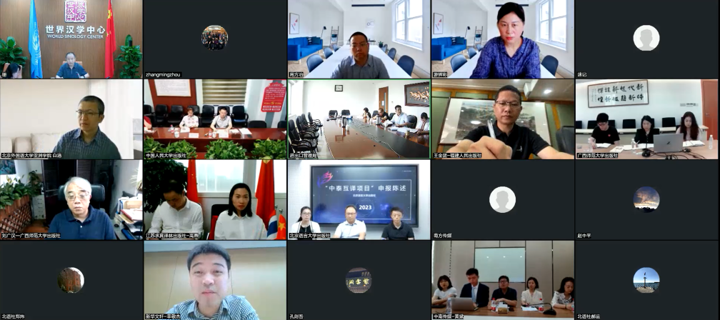 中宣部进出口管理局副局长赵海云,合作交流处处长钱风强,副处长范清华,与会评审专家生命树文化促进中心理事长张明舟,中国社会科学院亚太与全球战略研究院副研究员周方冶,广西民族大学东南亚语言文化学院教授游辉彩,北京外国语大学亚洲学院教授白湻等以线上的方式出席会议。会议由秘书处负责人、北京语言大学一带一路研究院院长徐宝锋教授主持。