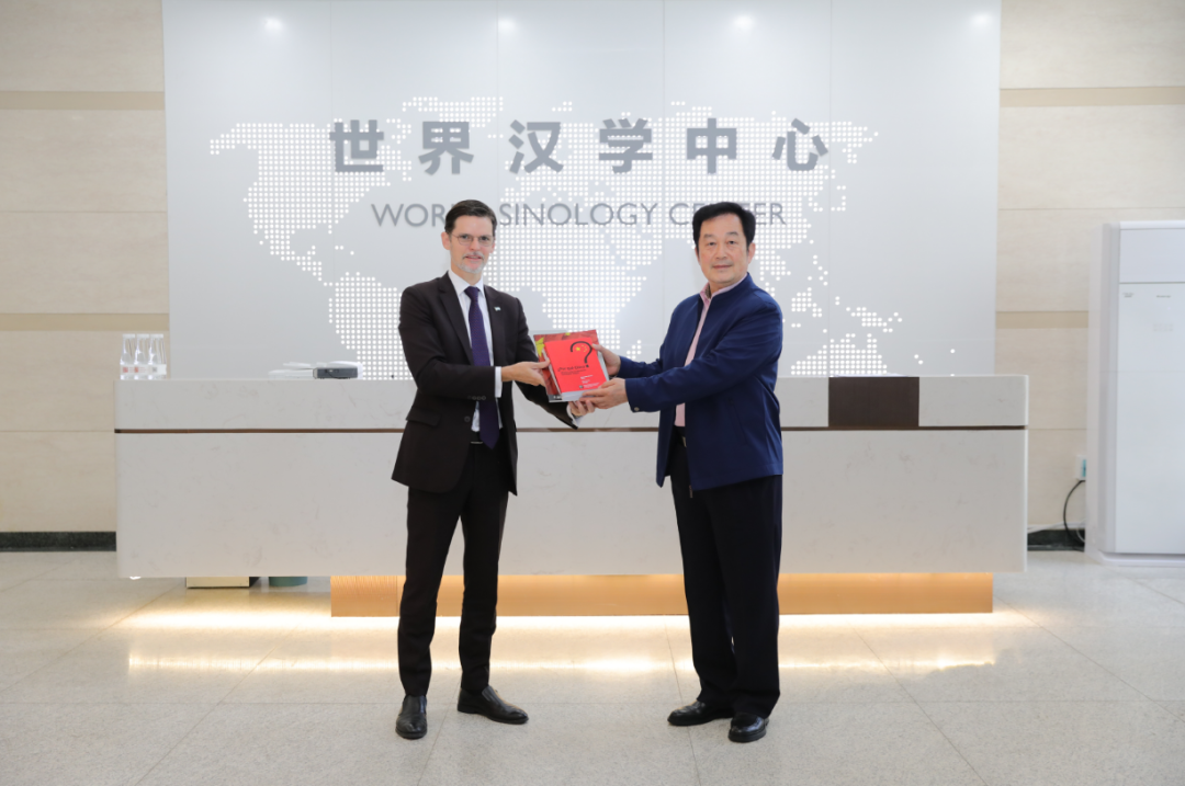 牛望道大使向世界汉学中心捐书,责任专家孙建华接受赠书。