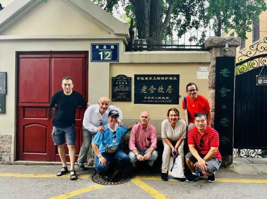 2023年,高伯译(中)与土耳其汉学家吉来(左一)、埃及汉学家阿齐兹(左二)、秘鲁汉学家邓如朋(左三)、北京语言大学孙新堂教授(右一)、委内瑞拉汉学家梅迪那(右二)和墨西哥汉学家莉莉亚娜(右三)在位于青岛的老舍故居门前合影。