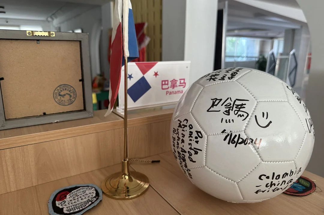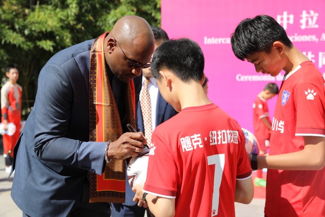 使节们与新区珠江路小学足球队共踢一场跨越、凝聚友谊的足球,格林纳达驻华大使马岩、巴拿马驻华大使馆参赞李可向学校足球队签字赠球。