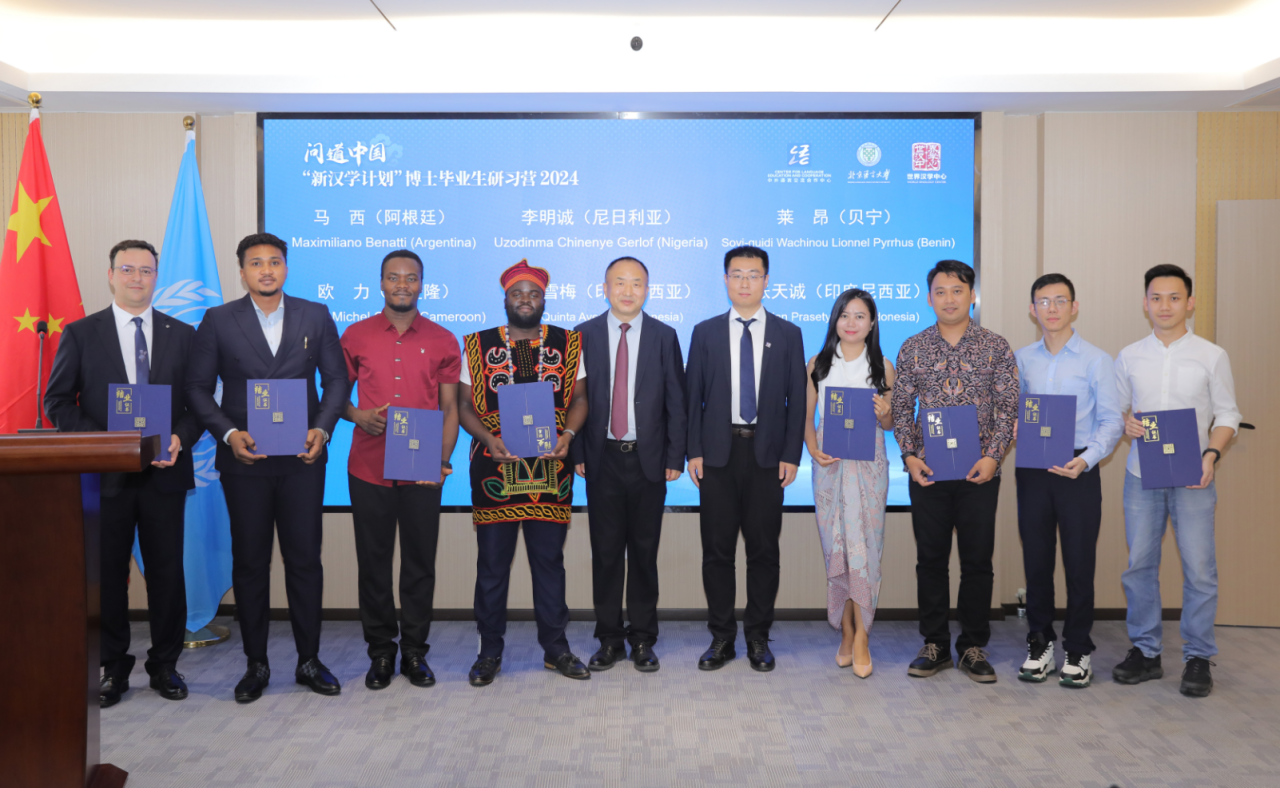 北京语言大学世界汉学中心主任、一带一路研究院院长、汉学与中国学学院院长徐宝锋,中外语言交流合作中心汉学研究处副处长王昕生一同为8位“新汉学计划”博士毕业生颁发“新汉学计划”博士项目结业证书。