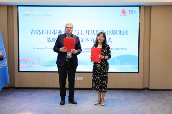 王倩松副总编辑与哈鲁克·海普康总裁互换青岛日报报业集团与土耳其红猫出版集团战略合作协议文本。