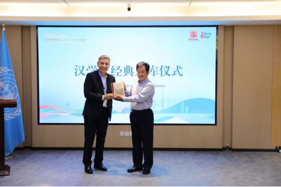 汉学家经典入库仪式,汉学家代表,“中国政府友谊奖”获得者高文勇(Evandro Menezes de Carvalho)向世界汉学中心赠书。