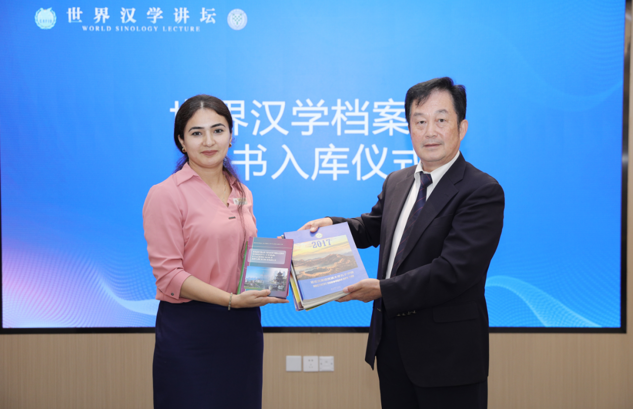2023年9月,在世界汉学讲坛现场,玛依娜(Imomzoda Mahina)向世界汉学中心捐赠书籍。