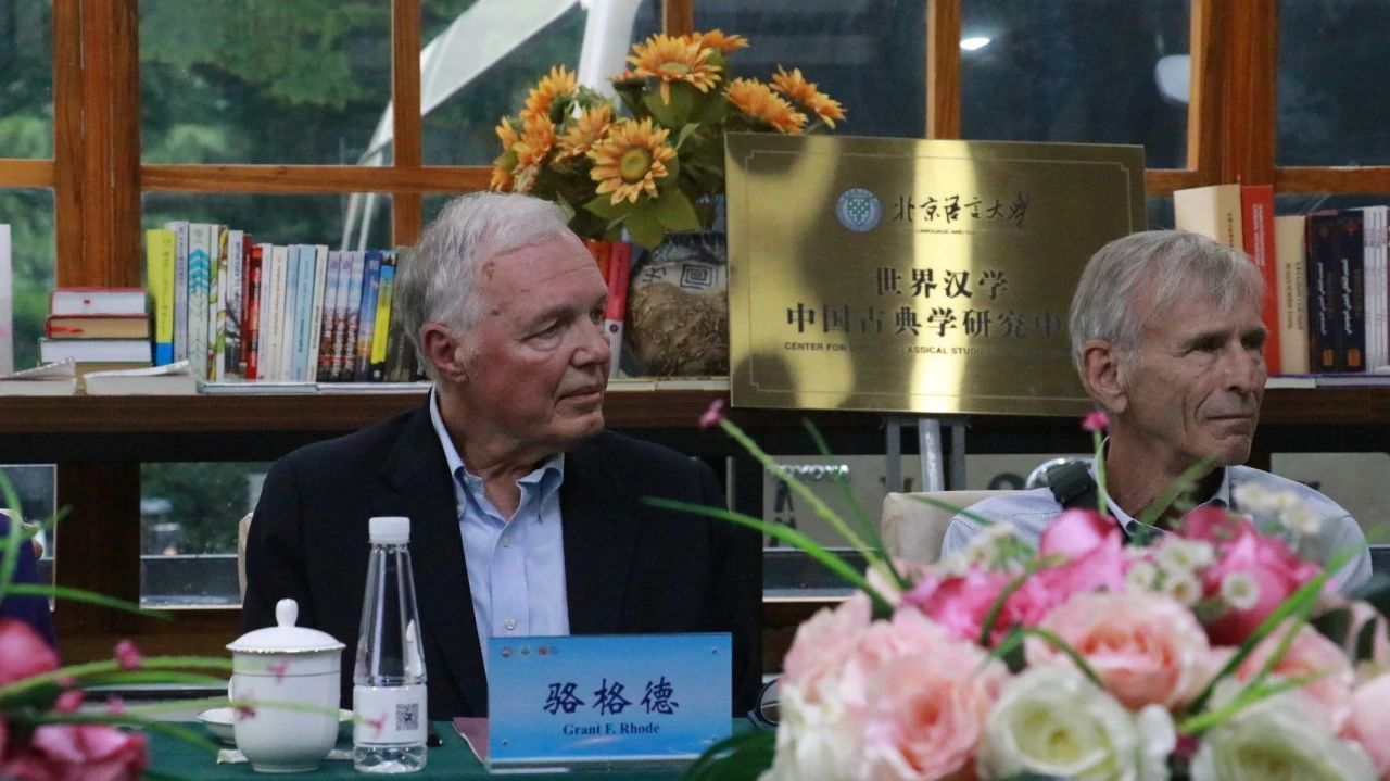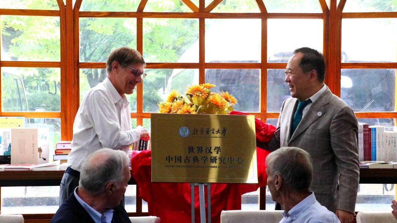 北京语言大学校长段鹏与美国南卡罗莱纳州堡垒学院历史系教授南恺时(Keith Knapp)共同为世界汉学中国古典学研究中心揭牌。