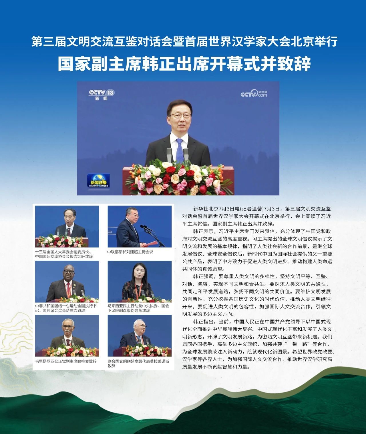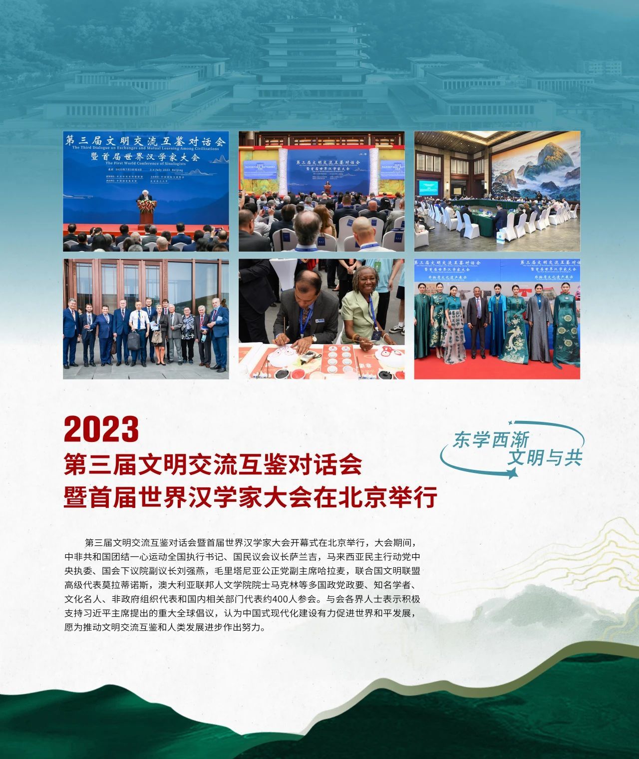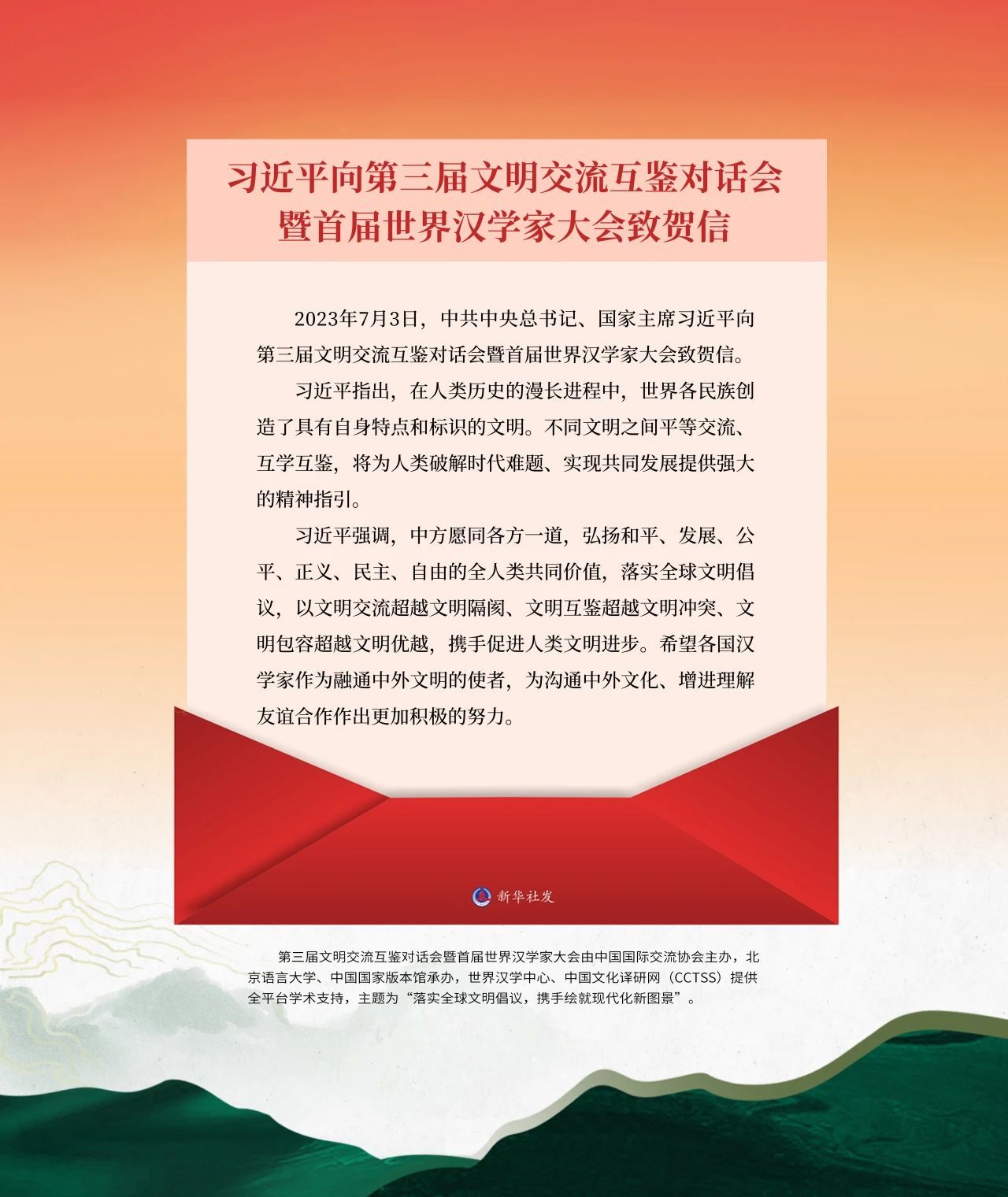 2023年7月3日,第三届文明交流互鉴对话会暨首届世界汉学家大会在北京召开。中共中央总书记、国家主席习近平向第三届文明交流互鉴对话会暨首届世界汉学家大会致贺信。中国国家副主席韩正出席开幕式并发表重要讲话。