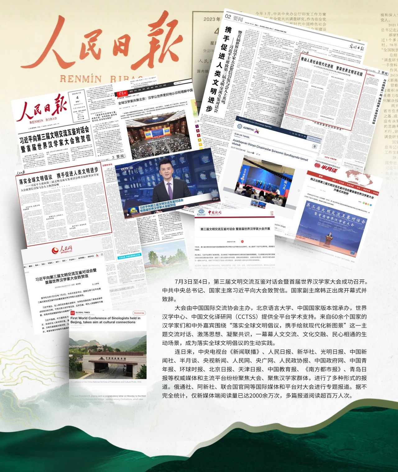 大会期间和大会前后,中央电视台《新闻联播》、人民日报、新华社、光明日报、中国新闻社、半月谈、央视新闻、人民网、央广网、人民政协报、中国政府网、中国青年报、环球时报、北京日报、天津日报、中国教育报、《南方都市报》、青岛日报等权威媒体和主流平台纷纷聚焦大会、聚焦汉学家群体,进行了多种形式的报道。俄通社、阿新社、联合国官网等国际媒体和平台对大会进行专题报道。据不完全统计,仅新媒体端阅读量已达2000余万次,多篇报道阅读超百万人次。