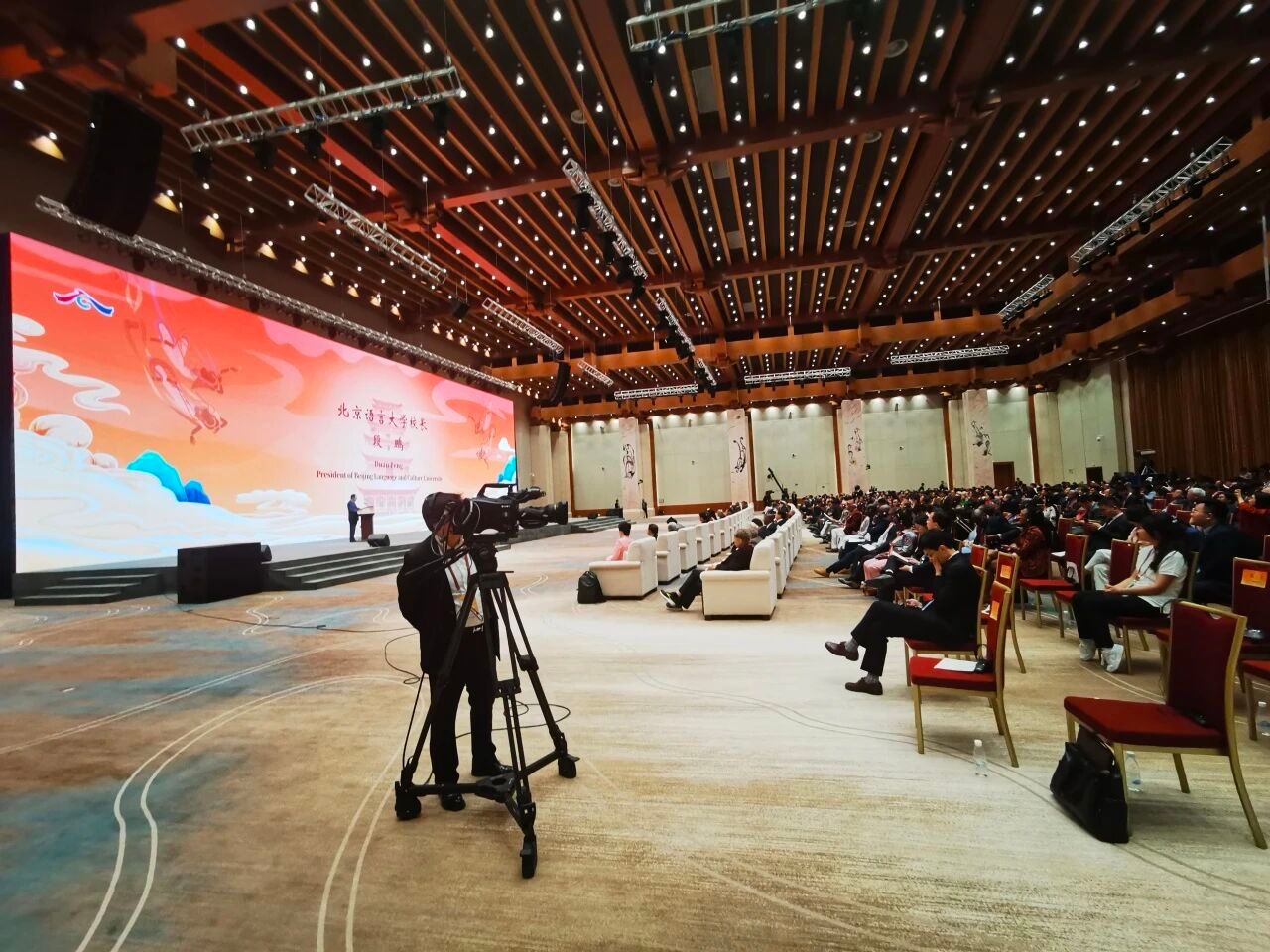 (北京语言大学校长段鹏校长,校长助理、学校办公室主任李志坚,世界汉学中心主任、一带一路(全球南方)研究院院长徐宝锋在开幕式现场。)
