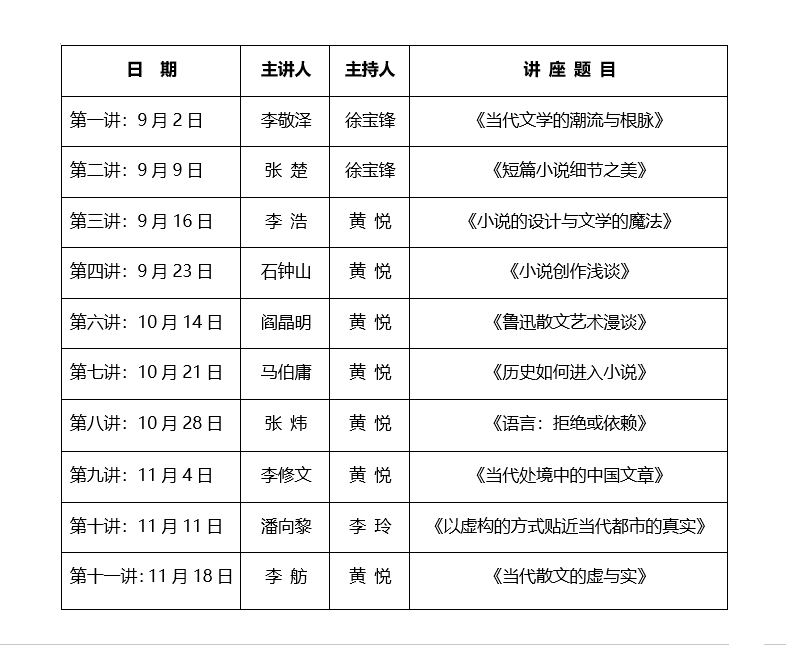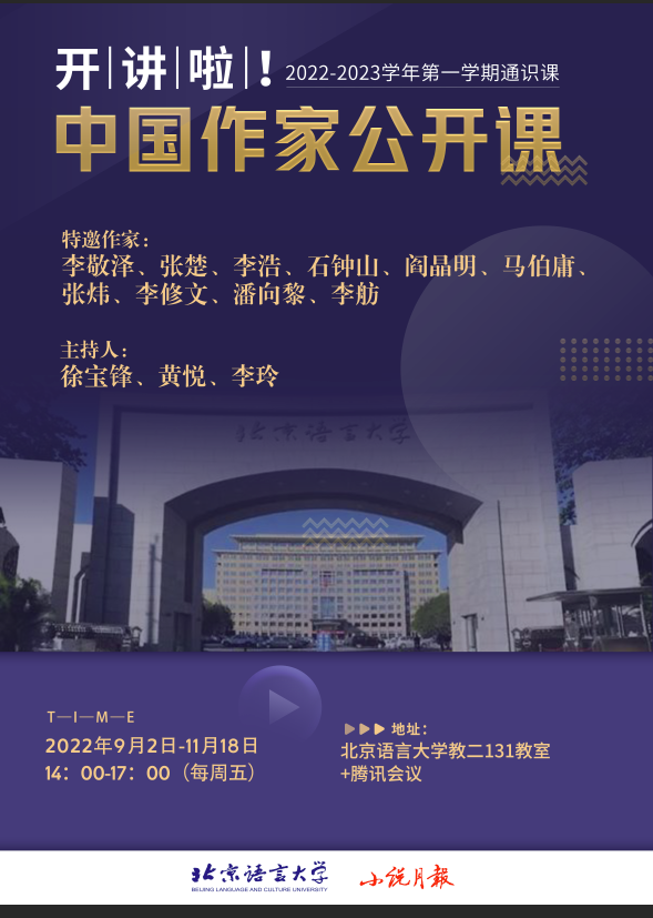 《中国作家公开课》以北京语言大学的校内通识课为基础,由我校教师联合百花文艺出版社《小说月报》,邀请中国当代有影响力的作家、批评家联合讲授,旨在引导大学生阅读当代经典,关怀中国社会,提升人文修养。