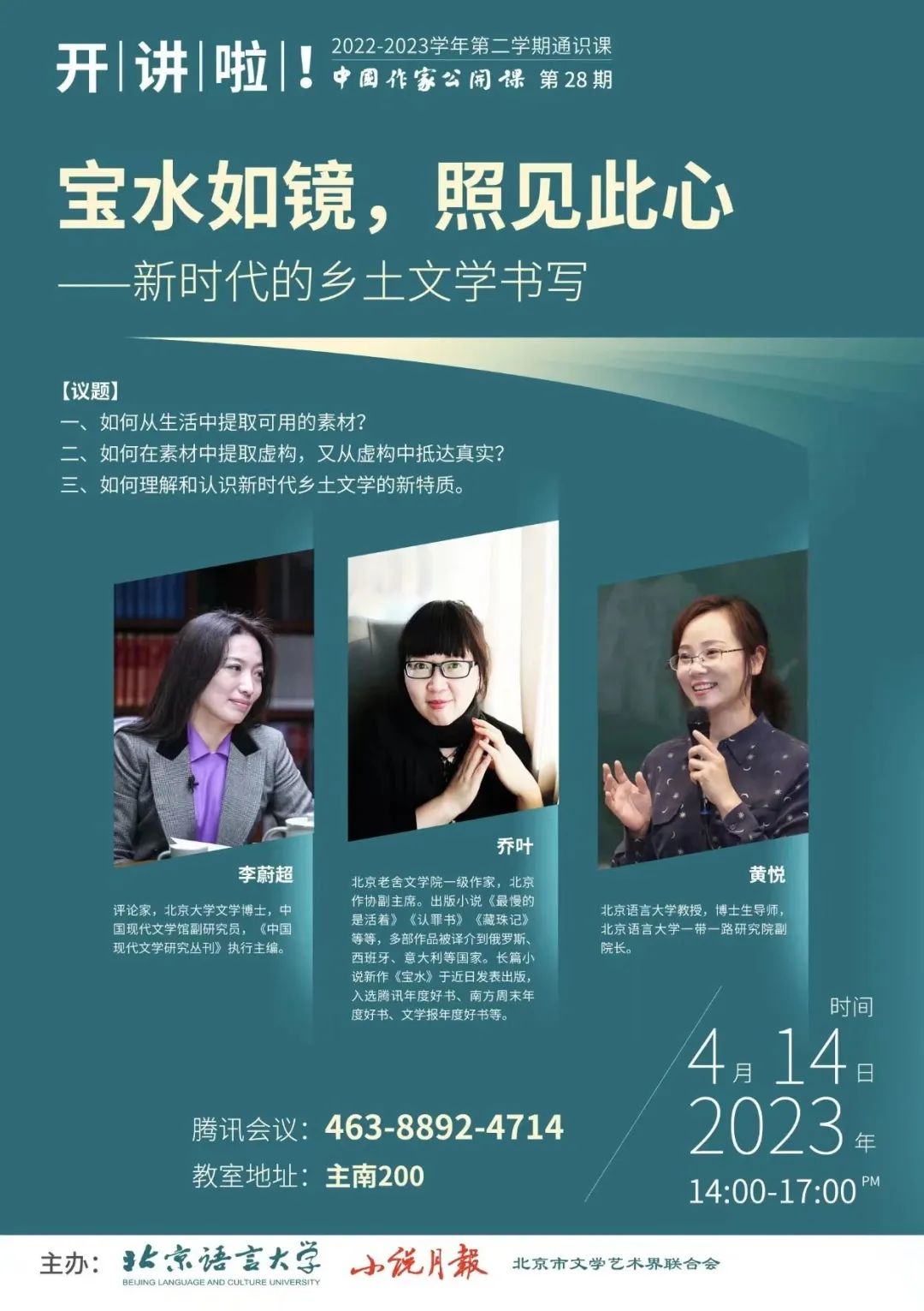 本期中国作家公开课将邀请作家乔叶为读者讲述新时代的乡土文学书写,由北京语言大学教授、一带一路研究院副院长黄悦担任学术主持,中国现代文学馆副研究员、《中国现代文学研究丛刊》执行主编李蔚超担任与谈人。