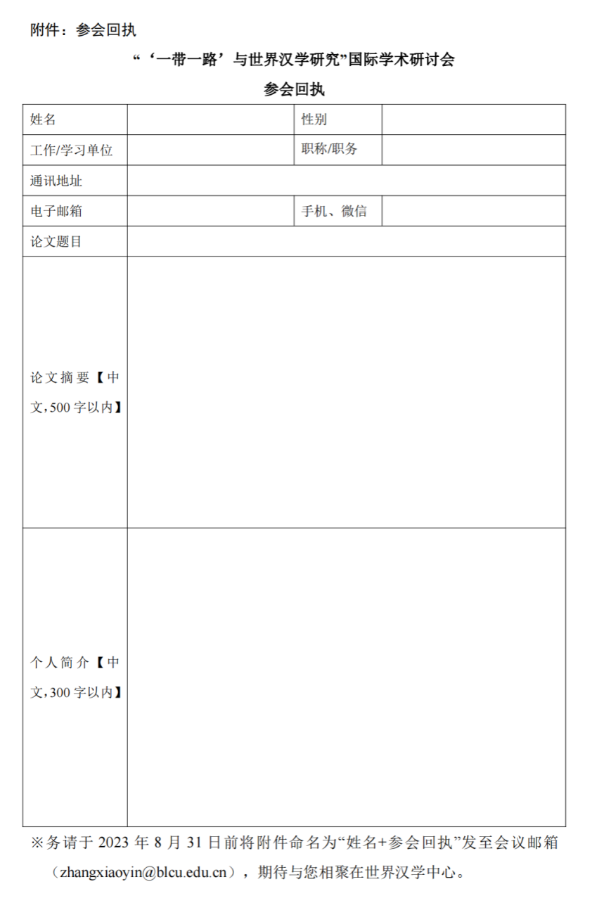 ②提交方式:请以邮件附件形式发至会议邮箱zhangxiaoyin@blcu.edu.cn。参会回执经主办方审核后,将发出正式邀请函。参会论文提交时间将另行通知。