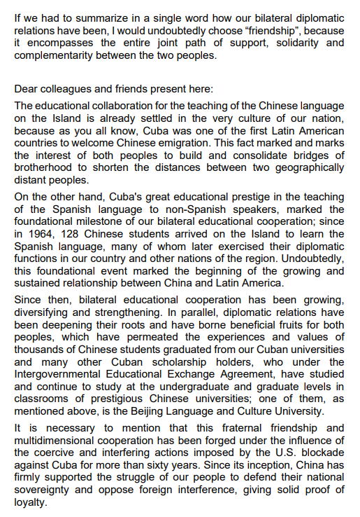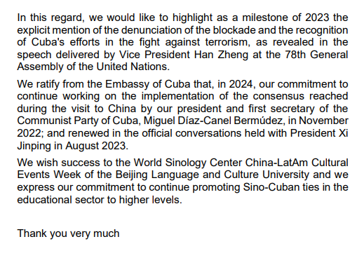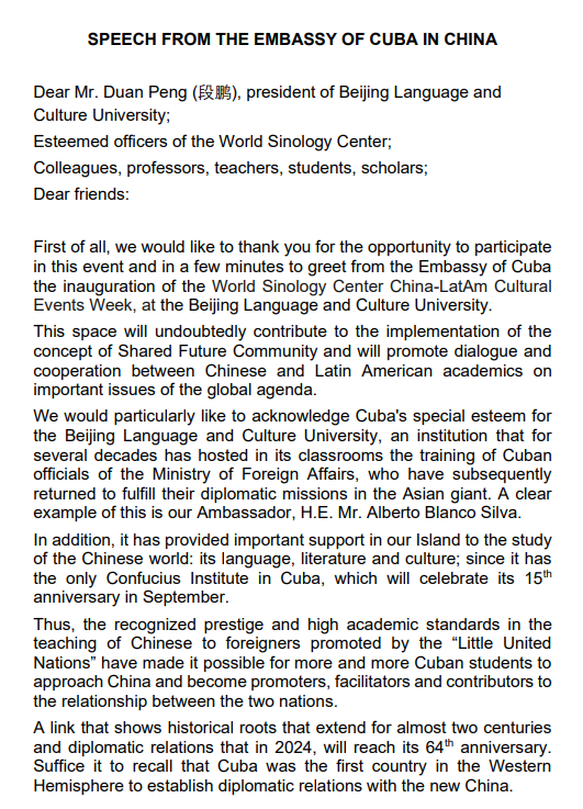 古巴驻华大使馆在贺信中表达了对“为了共同的明天—中拉汉学季”活动的高度赞赏和支持。并对北京语言大学以及世界汉学中心长期以来推动中古和中拉人文交流表示感谢。