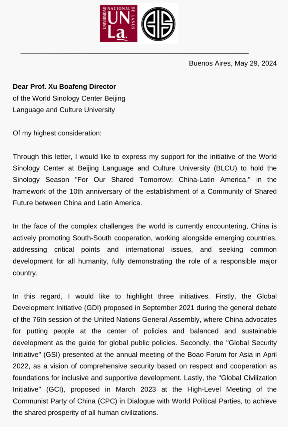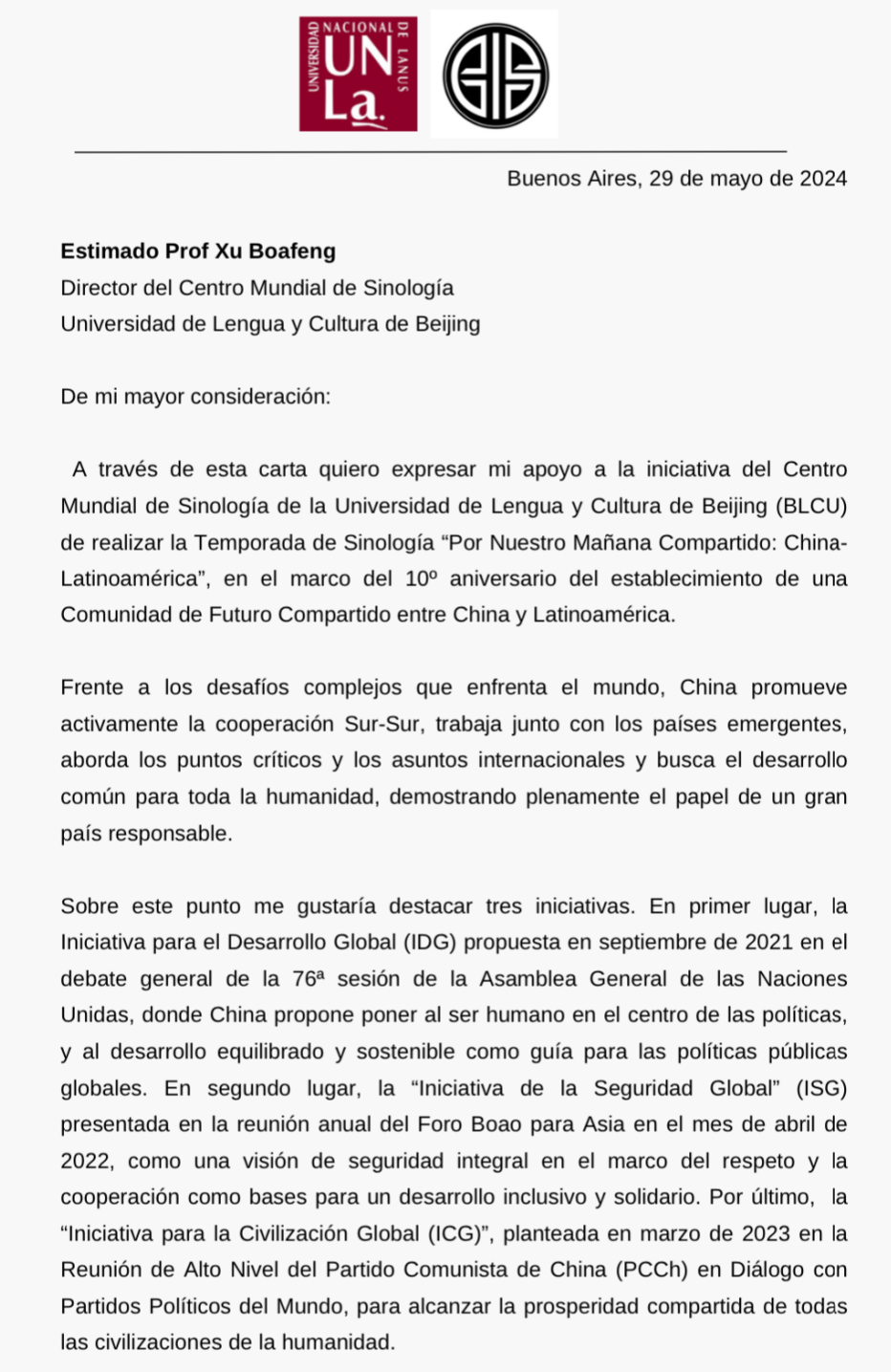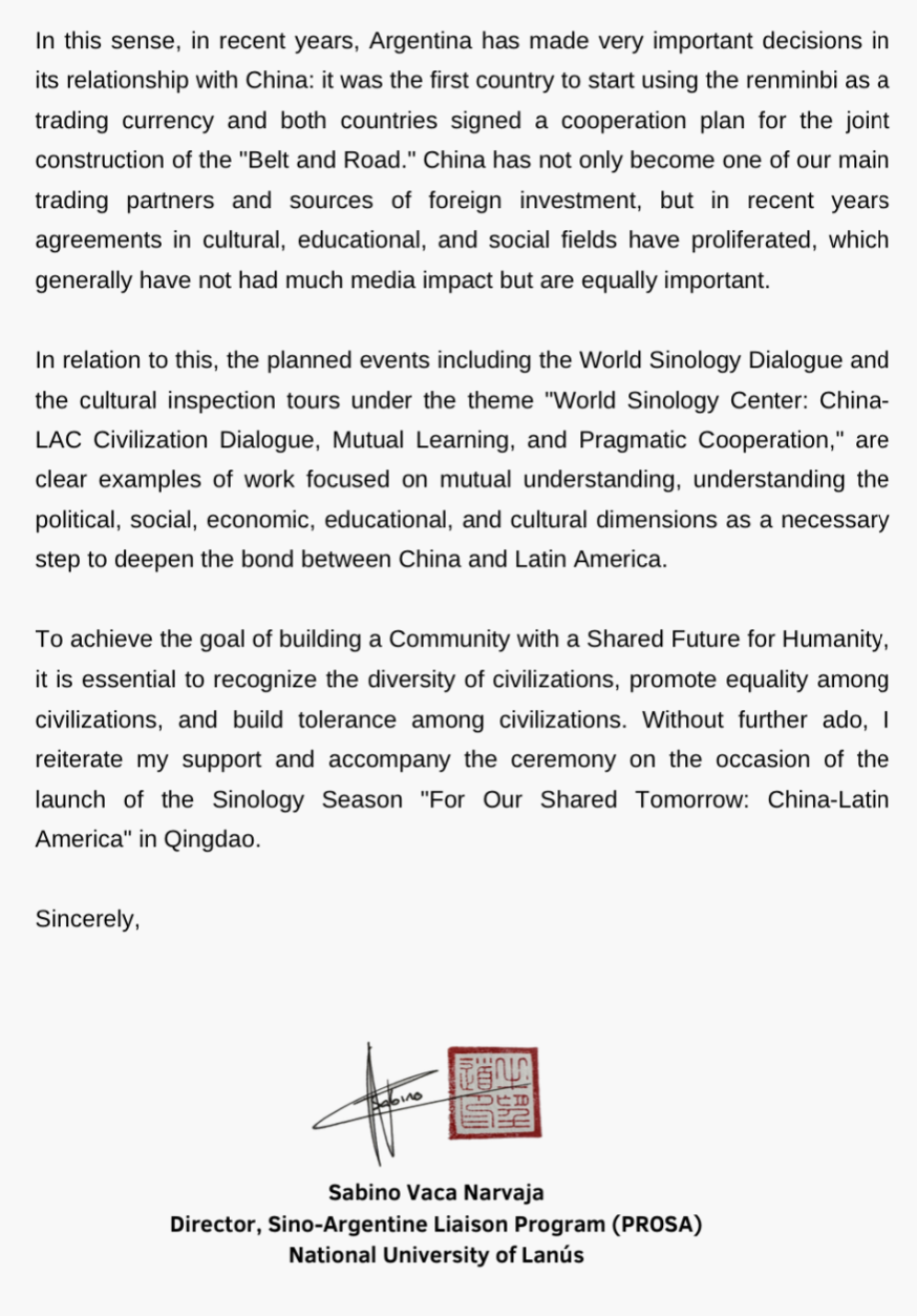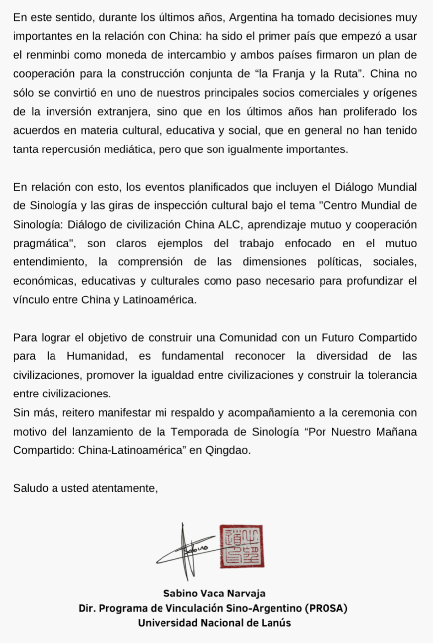 阿根廷政治学家、阿根廷前驻华大使牛望道(Gustavo Sabino Vaca Narvaja)在贺信中表示,世界汉学中心所举行的一系列活动是增进中拉双方在政治、社会、经济、教育及文化等多层面的相互理解与合作的典范。这些活动不仅为深化中国与拉丁美洲之间的联系提供了宝贵的机会,更是构建人类命运共同体不可或缺的一环。为了实现这一宏伟目标,我们必须尊重文明的多样性,促进文明间的平等对话,并构建宽容互鉴的文化氛围。在此,我坚定地表达我的支持,并将积极参与在青岛举行的“为了共同的明天—中拉汉学季”系列活动,共同推动中拉文明交流互鉴的新篇章。
