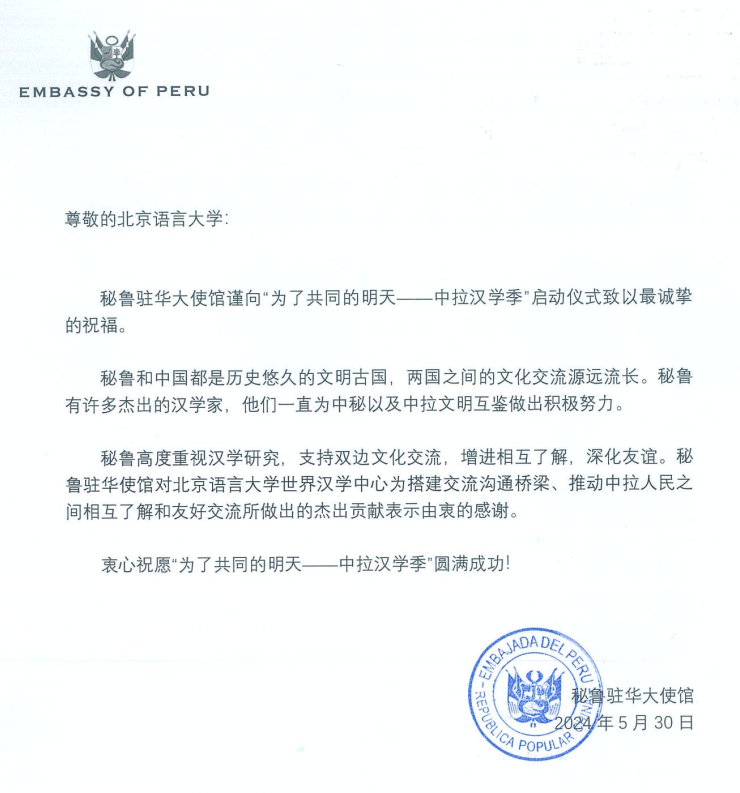 秘鲁驻华大使馆在贺信中表示,秘鲁驻华使馆对北京语言大学世界汉学中心为搭建交流沟通桥梁、推动中拉人民之间相互了解和友好交流所做出的杰出贡献表示由衷的感谢。