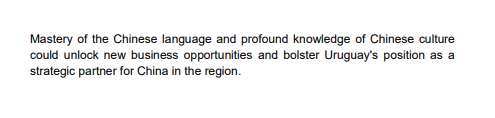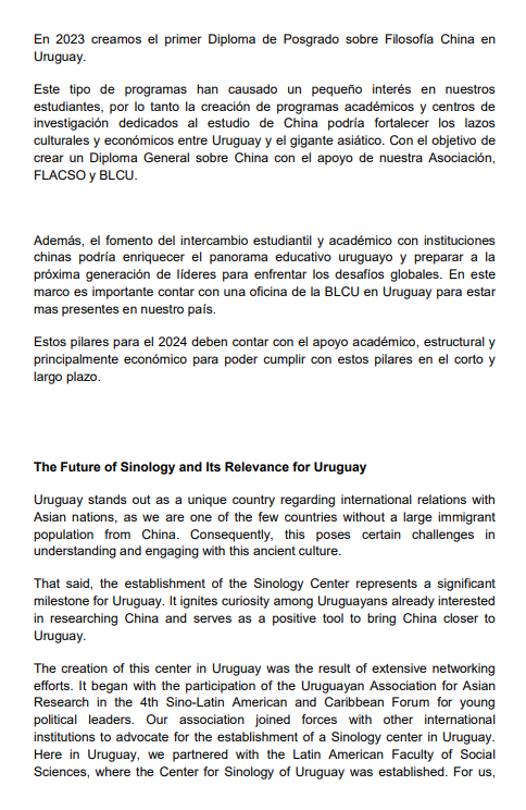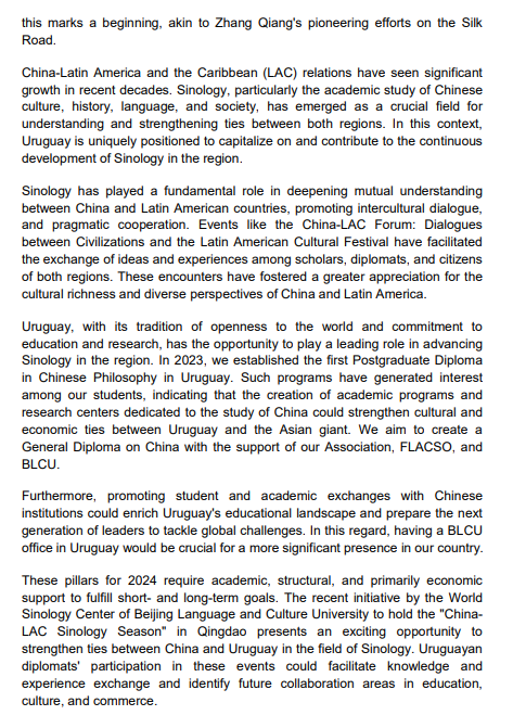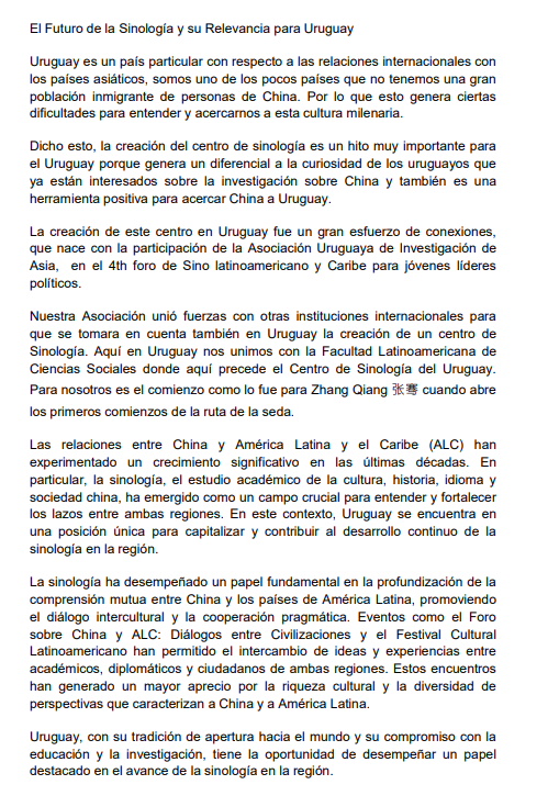 乌拉圭汉学家理事会召集人,乌拉圭著名汉学家,乌拉圭亚非研究中心主任CARLOS MARTIN PEREZ BANASCO表示,在世界汉学中心的支持下,乌拉圭建立了汉学中心,不仅加强了国内对中国研究的热情,更成为深化中乌两国关系的桥梁,成为乌拉圭促进地区汉学发展坚定决心的象征。希望此次活动进一步加强中拉文明间的交流与对话,共同书写中拉合作的新篇章。