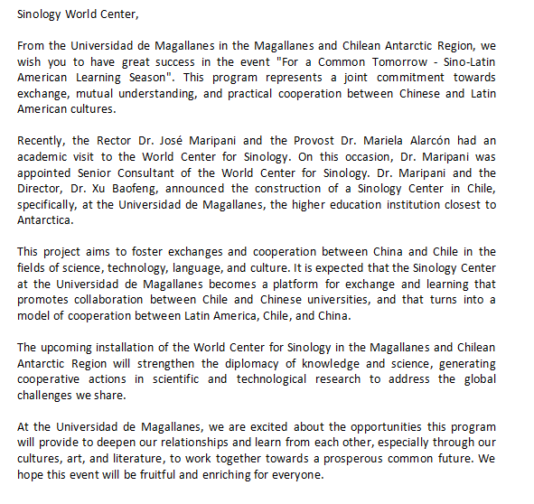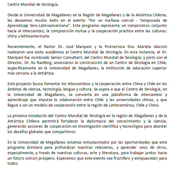 智利麦哲伦大学在贺信中表示,麦哲伦大学与世界汉学中心已经启动在智利共同建设汉学中心,以促进双方在科学、技术、语言和文化等领域的深入交流与合作,并期待通过此次活动深化中拉关系,促进双方共同繁荣。