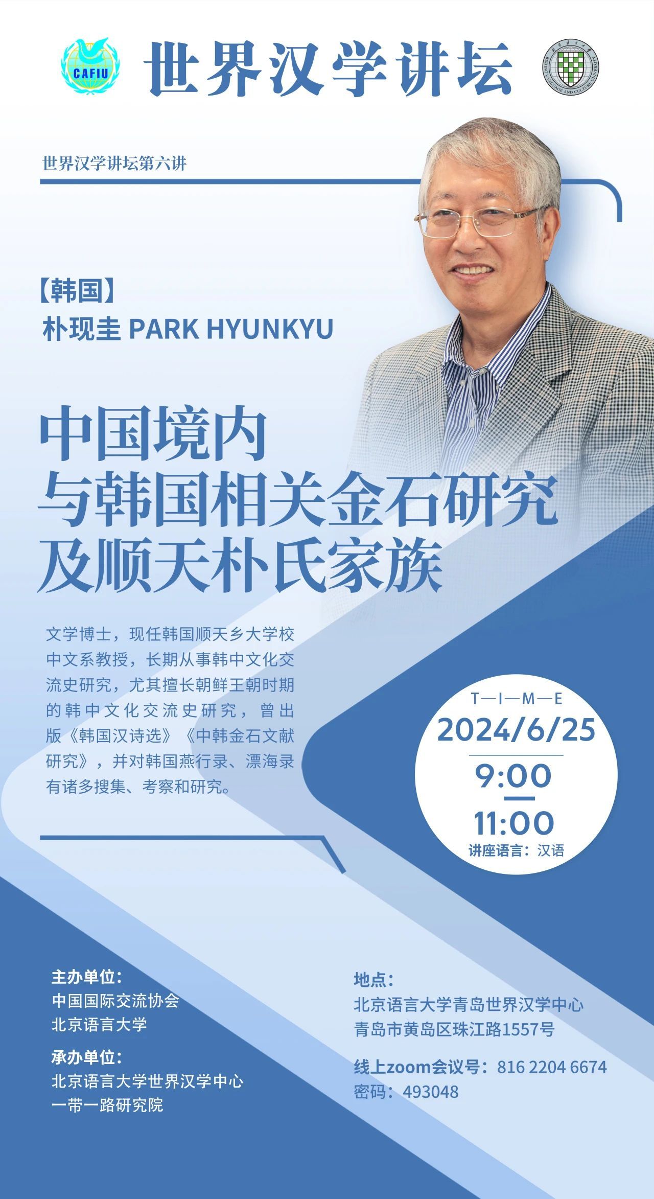 主讲人:朴现圭,文学博士,现任韩国顺天乡大学校中文系教授,长期从事韩中文化交流史研究,尤其擅长朝鲜王朝时期的韩中文化交流史研究,曾出版《韩国汉诗选》《中韩金石文献研究》,并对韩国燕行录、漂海录有诸多搜集、考察和研究。