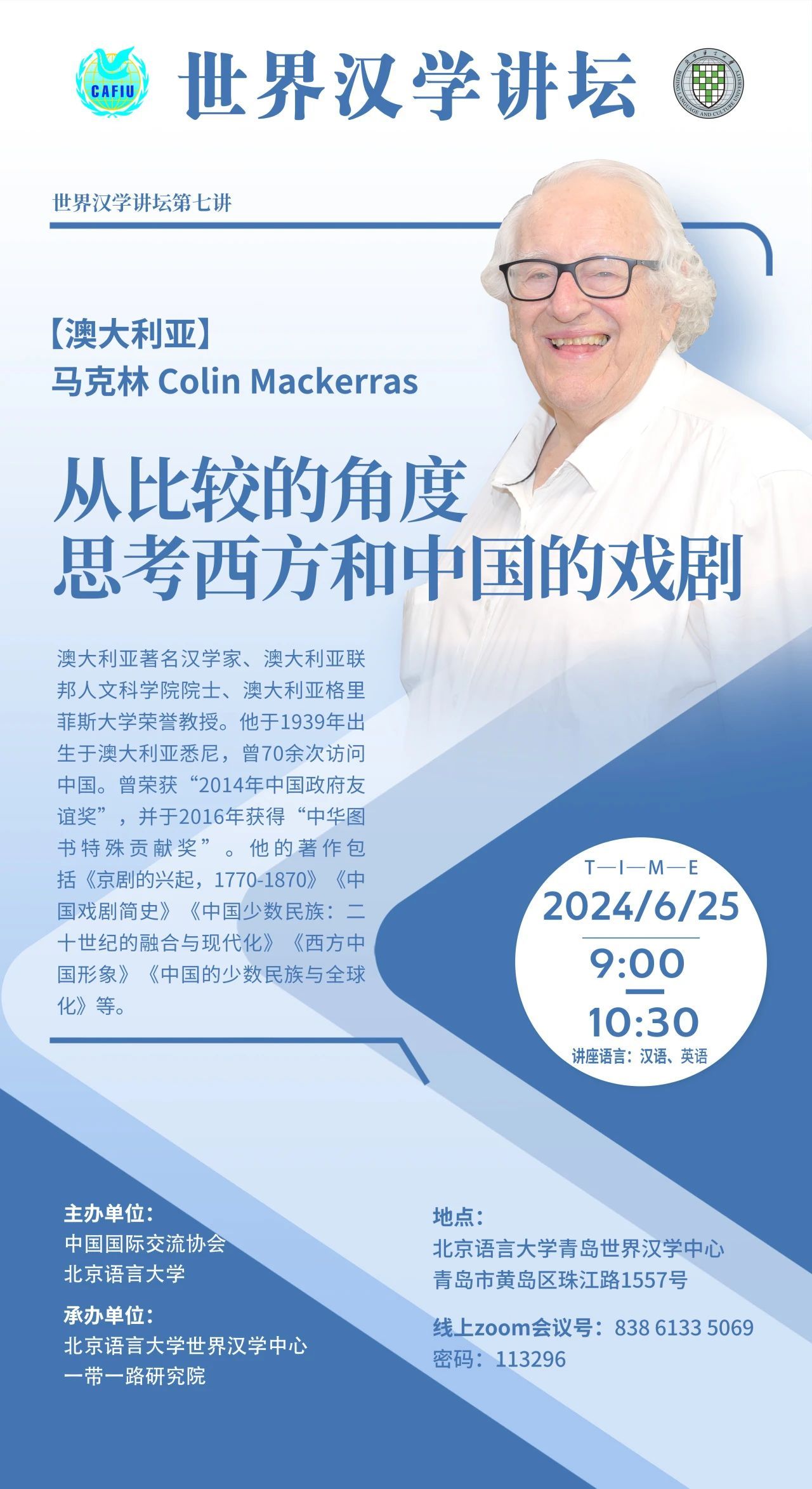主讲人:澳大利亚·马克林(Colin Mackerras),澳大利亚著名汉学家、澳大利亚联邦人文科学院院士、澳大利亚格里菲斯大学荣誉教授。他于1939年出生于澳大利亚悉尼,曾70余次访问中国。曾荣获“2014年中国政府友谊奖”,并于2016年获得“中华图书特殊贡献奖”。他的著作包括《京剧的兴起,1770-1870》《中国戏剧简史》《中国少数民族:二十世纪的融合与现代化》《西方中国形象》《中国的少数民族与全球化》等。