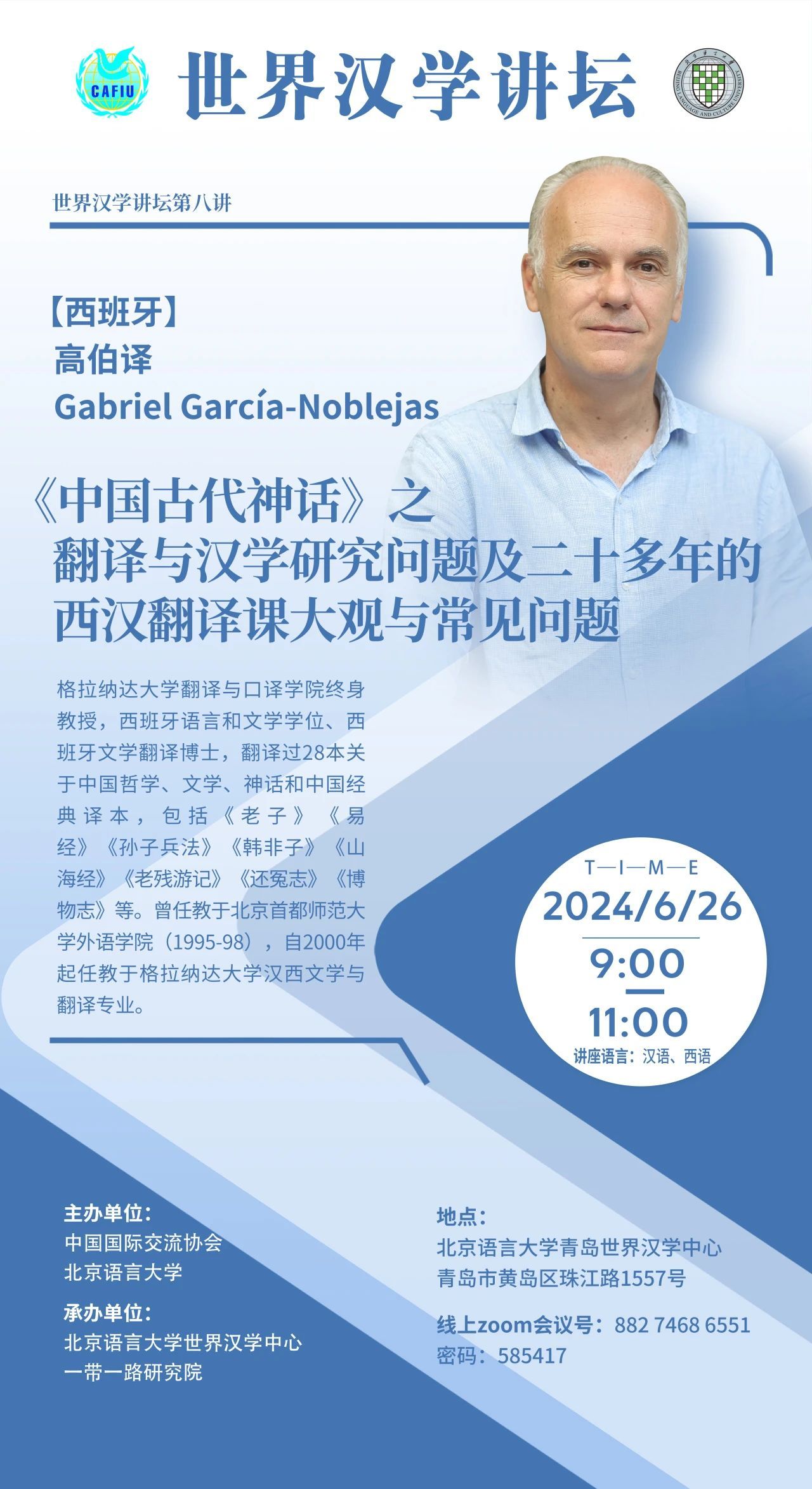 主讲人:西班牙·高伯译(Gabriel García-Noblejas),格拉纳达大学翻译与口译学院终身教授,西班牙语言和文学学位、西班牙文学翻译博士,翻译过28本关于中国哲学、文学、神话和中国经典译本,包括《老子》《易经》《孙子兵法》《韩非子》《山海经》《老残游记》《还冤志》《博物志》等。曾任教于北京首都师范大学外语学院(1995-98),自2000年起任教于格拉纳达大学汉西文学与翻译专业。
