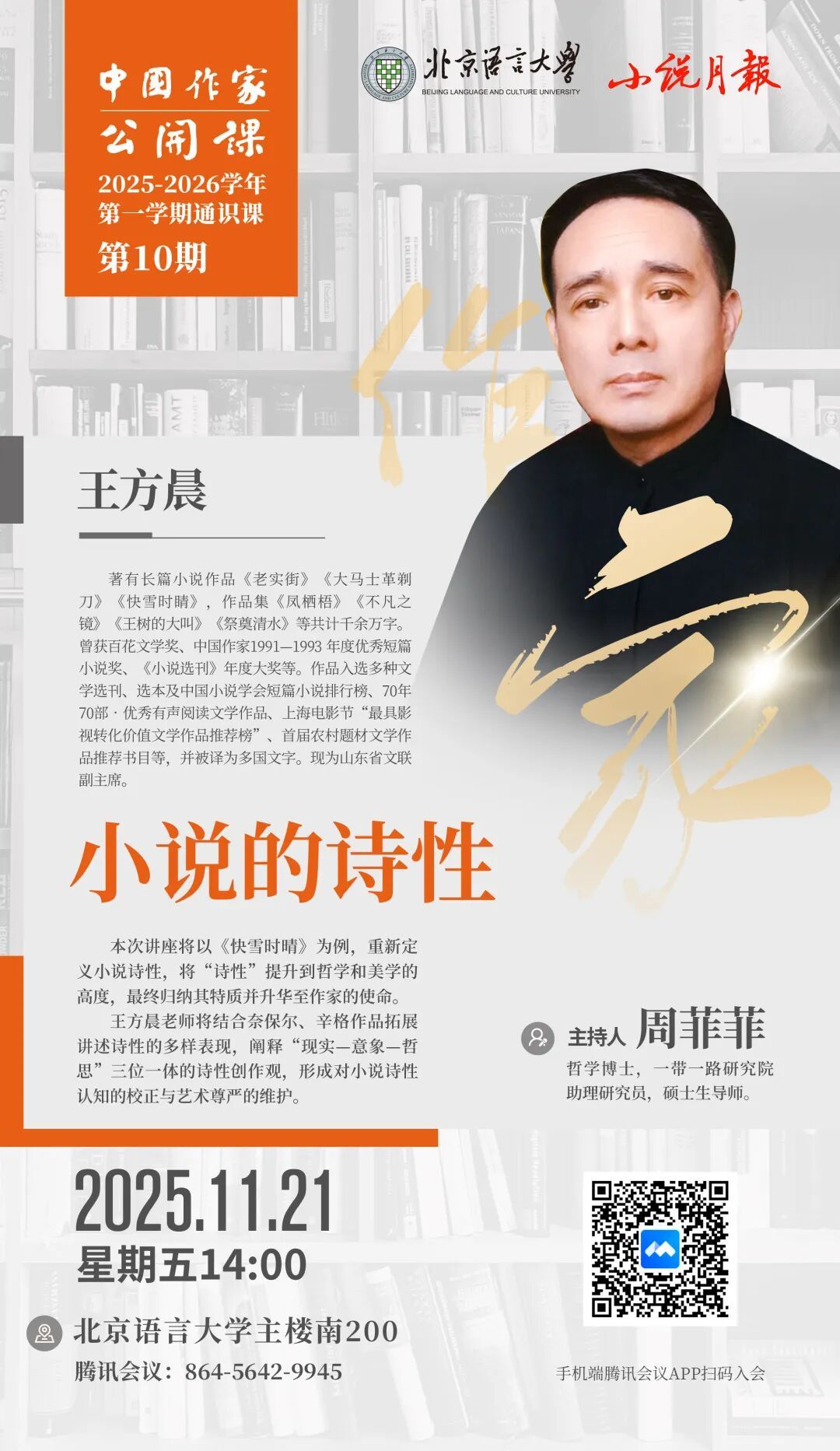 讲座将于11月21日在北京语言大学举行,将为听众揭示小说背后的诗性世界。